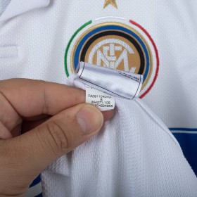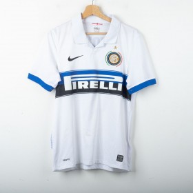 Maglia Away dell'Inter stagione 2009/2010 realizzata da Nike. La divisa è di colore bianco con una banda orizzontale nera e blu al centro del petto. Presenti lo swoosh Nike, lo sponsor commerciale Pirelli e lo stemma del club con stella e coccarda della Coppa Italia. Sul retro è presente la personalizzazione Eto'o con il numero 9. Taglia: S, come indicato sull'etichetta interna “Nike – Size S”.