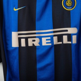 Maglia home dell'Inter stagione 1999/2000, realizzata da Nike e personalizzata con il nome Ronaldo e numero 9. Design a righe verticali nerazzurre. Logo Nike e stemma Inter sul petto, sponsor centrale Pirelli. Modello a maniche corte con colletto a girocollo. Etichetta taglia visibile XXL.