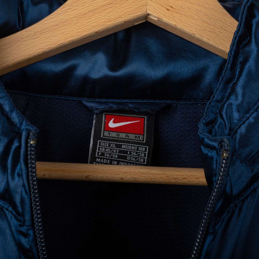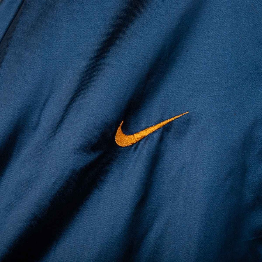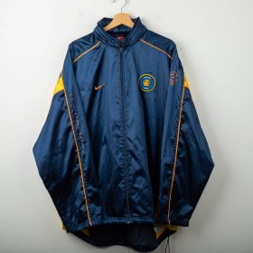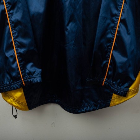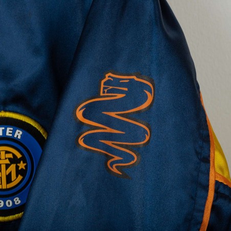 Giacca dell'Inter indossata durante la stagione 2001/2002, prodotta da Nike. Colore blu navy con dettagli arancioni e inserti gialli sulle maniche. Logo Nike ricamato e stemma Inter applicato lato cuore, con la data di fondazione “1908”. Sul retro, iconico logo Nike cucito all'altezza del collo. Presente anche il simbolo del Biscione, storico emblema del club, stampato sulla manica destra. Vestibilità ampia. Taglia XL.