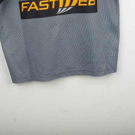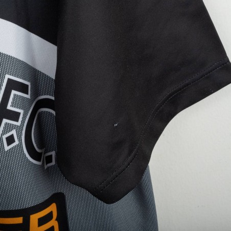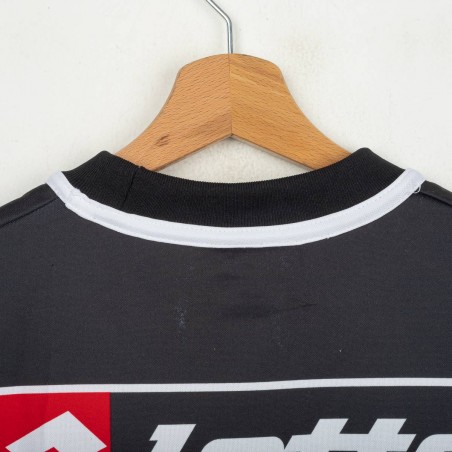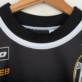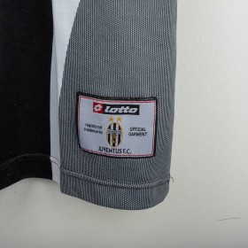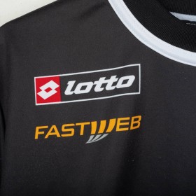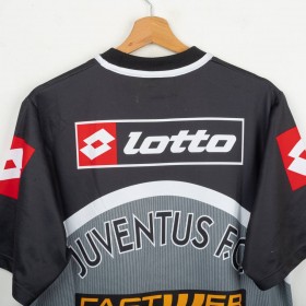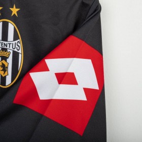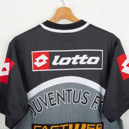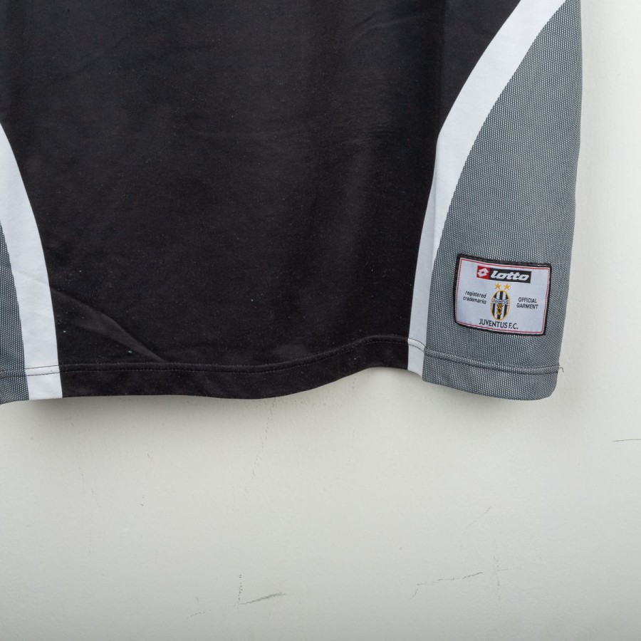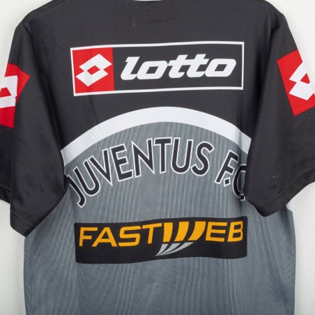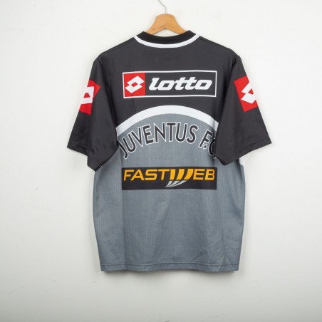 T-shirt da allenamento della Juventus utilizzata nella stagione 2001/2002, realizzata da Lotto. Colore nero con inserti grigi e bianchi sui fianchi. Logo Lotto stampato sul petto destro e sulle maniche, sponsor "Fastweb" applicato sul fronte e sul retro. Stemma Juventus con due stelle stampato in sublimatico lato cuore. Girocollo nero con profilo bianco. Ampia stampa “Juventus F.C.” sul retro. Vestibilità regolare. Taglia M. Prodotto ufficiale Lotto, fornitore tecnico Juventus.