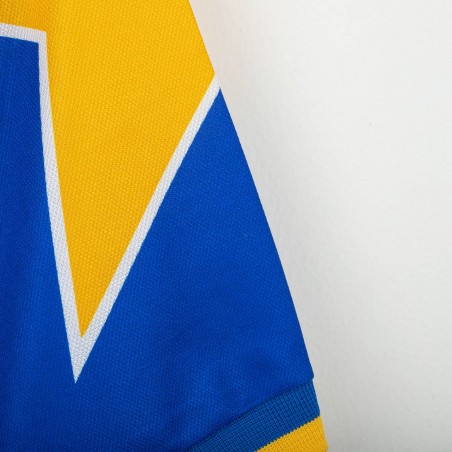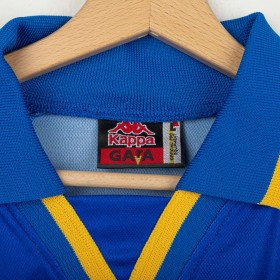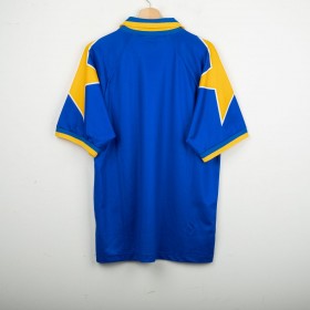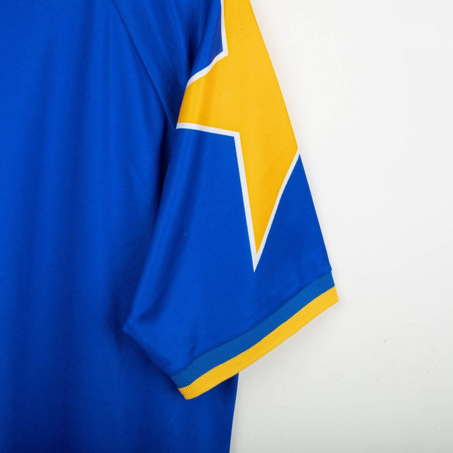 Maglia away Juventus della stagione 1994/1995, prodotta da Kappa. Storica versione da trasferta di colore blu con dettagli gialli su colletto e maniche. Sponsor centrale stampato in sublimatico. Logo Kappa ricamato sul petto destro e stemma Juventus cucito lato cuore con due stelle dorate. Sul retro presenti le grandi stelle gialle stampate sulle maniche. Colletto a polo blu con profilo giallo e apertura a V. Maniche corte. Vestibilità regolare. Taglia L.