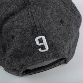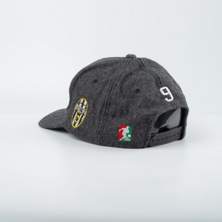 Cappello Juventus prodotto da Kappa negli anni '80. Modello in lana grigia con chiusura snapback regolabile in plastica. Sul fronte campeggia la scritta “JUVENTUS” ricamata in verde con profilo bianco. Sul lato destro stemma Juventus cucito, mentre sul retro sono presenti il numero “9” ricamato e il logo FSM in tricolore. Design caldo e robusto, tipico degli accessori sportivi dell'epoca, legato alle stagioni in cui la Juve era protagonista in Italia e in Europa.