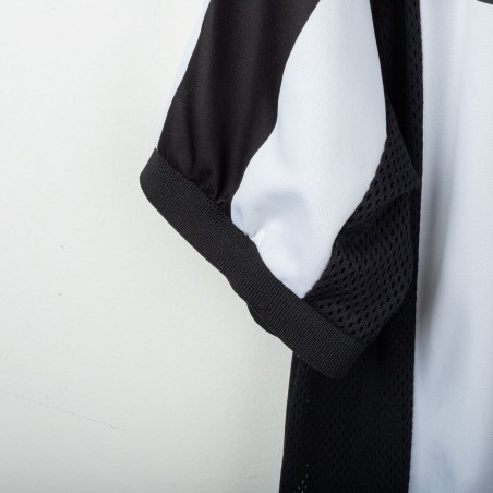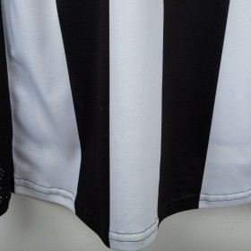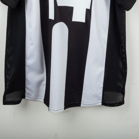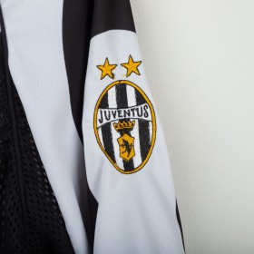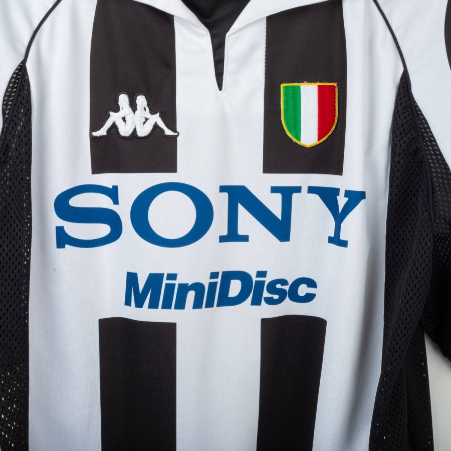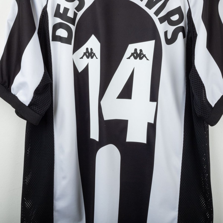 Maglia home della Juventus prodotta da Kappa per la stagione 1997/1998, personalizzata con il nome Deschamps e il numero 14. Modello a manica corta con le classiche strisce verticali bianconere. Sponsor tecnico Kappa ricamato e sponsor commerciale “Sony MiniDisc” stampato sul petto. Stemma Juventus con due stelle ricamato sulla manica sinistra. Sul retro presente la personalizzazione “DESCHAMPS” e numero 14 in bianco con loghi Kappa. Vestibilità regolare. Taglia L.