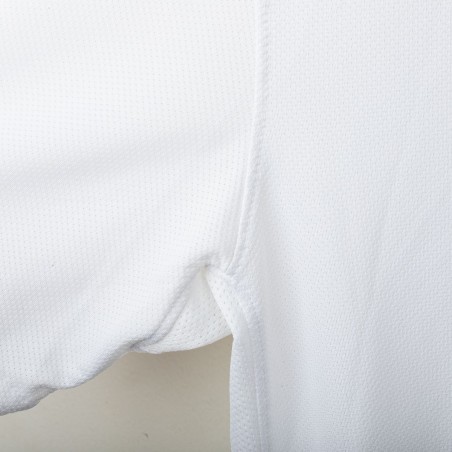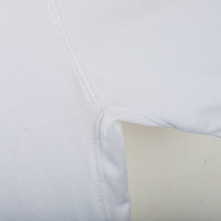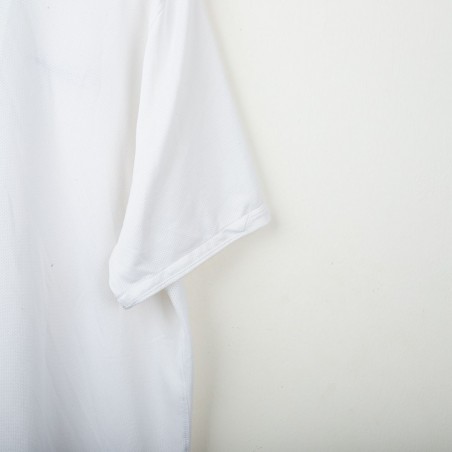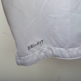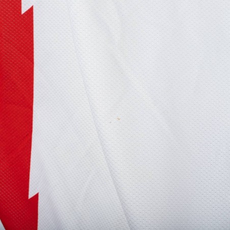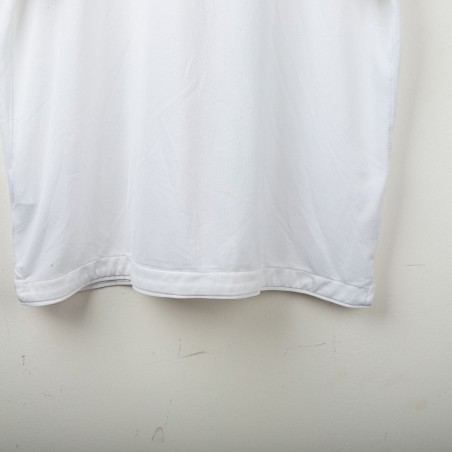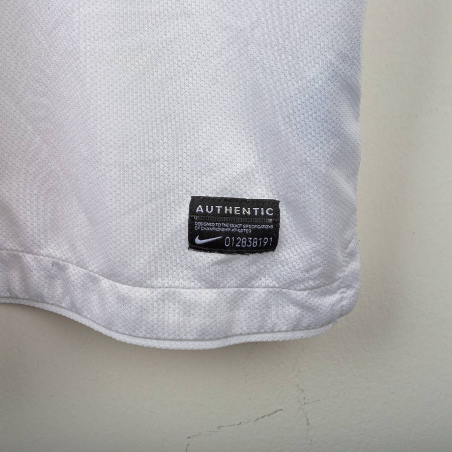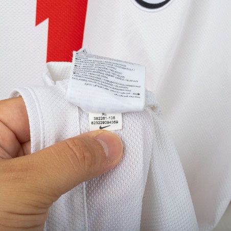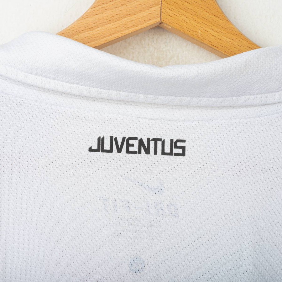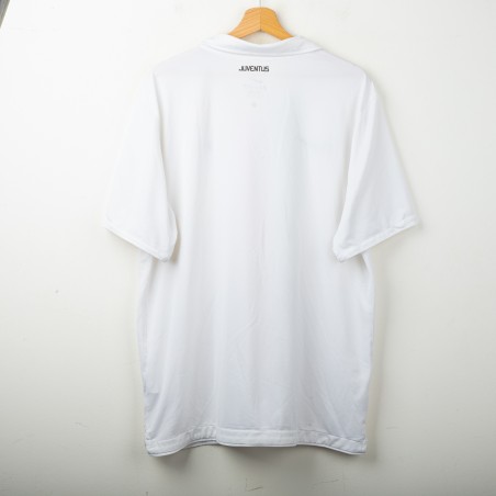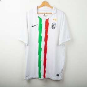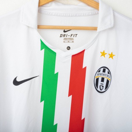 Maglia away della Juventus prodotta da Nike per la stagione 2010/2011. Modello a manica corta di colore bianco, caratterizzato da una grafica centrale a zig-zag nei colori della bandiera italiana (verde, bianco e rosso). Lo sponsor tecnico Nike è ricamato in nero sul petto destro, mentre lo stemma del club con due stelle è cucito sul lato cuore. Sul retro, sotto al colletto, la scritta “JUVENTUS” in nero. Vestibilità regolare. Taglia XL.