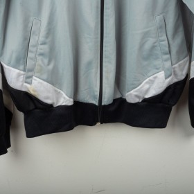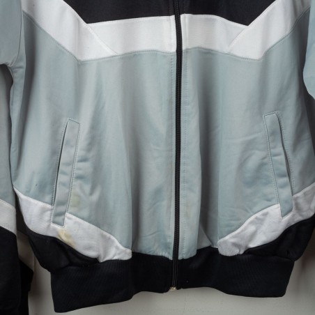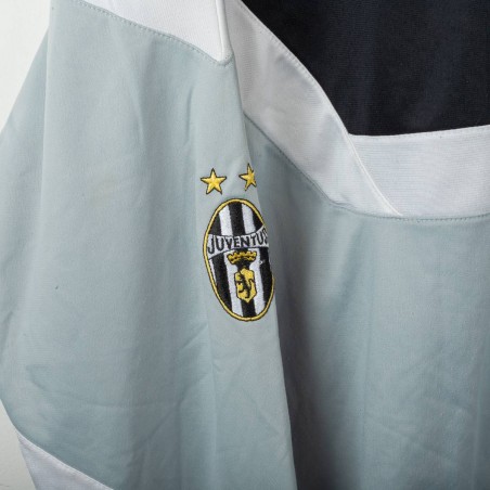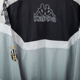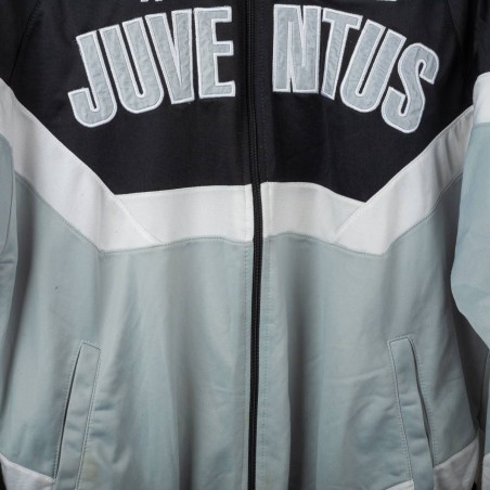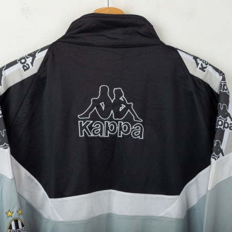Giacca da bambino della Juventus prodotta da Kappa per la stagione 1994/1995. Modello full zip con tasche laterali, caratterizzato dai colori grigio, nero e bianco. Logo Kappa ricamato in bianco sul petto destro e grandi scritte "JUVENTUS" cucite al centro, con sponsor commerciale Danone applicato sopra. Sulle maniche banda con loghi Kappa ripetuti e stemma Juventus ricamato con due stelle sul braccio. Sul retro maxi logo Kappa ricamato. Vestibilità regolare. Taglia L (bambino).