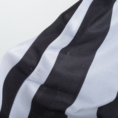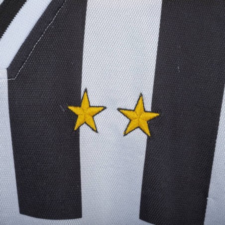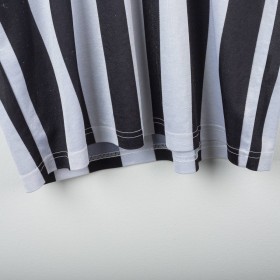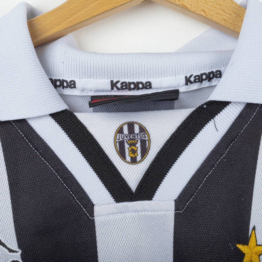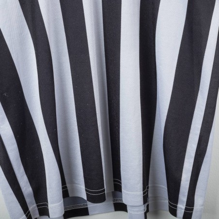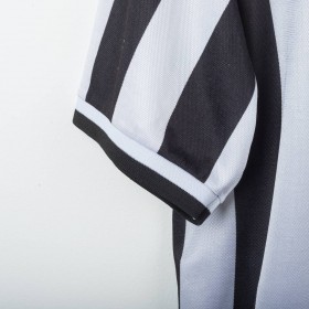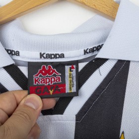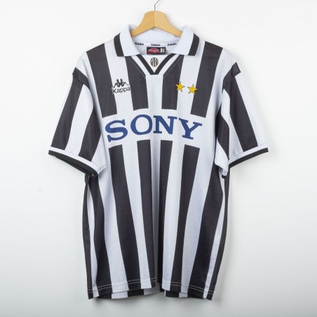 Maglia home della Juventus stagione 1995/1996, prodotta da Kappa nella linea “Gara – Official Pro Equipment”. Classiche strisce bianconere con colletto a polo bianco e dettagli neri. Logo Kappa cucito sul petto destro, stemma Juventus ricamato lato cuore con due stelle e sponsor Sony stampato al centro. Sul retro nome e numero Ravanelli 11 stampati, con logo Kappa nel numero. Tessuto leggero e traspirante, tipico design anni '90. Una maglia storica, legata alla stagione della vittoria della Champions League a Roma contro l'Ajax. Taglia L.
