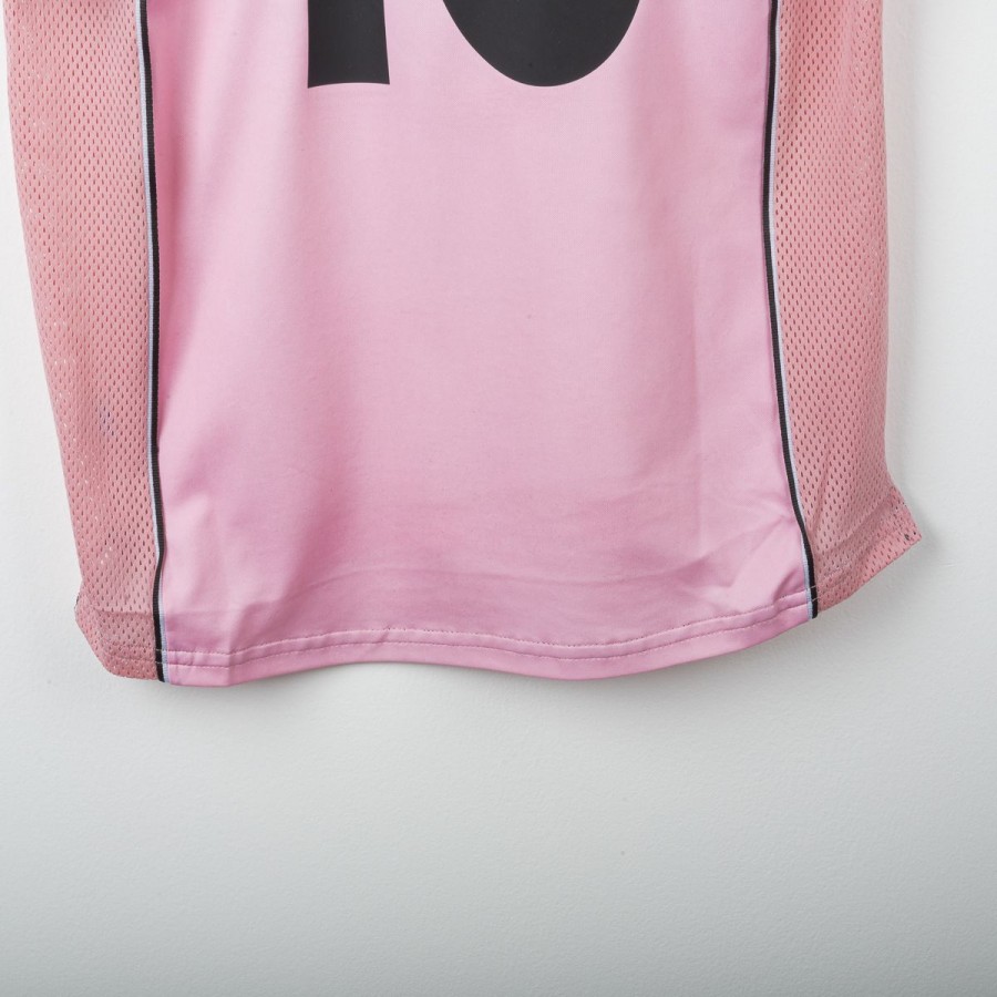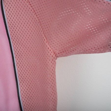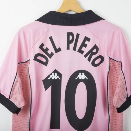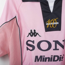 Maglia celebrativa Centenario Juventus stagione 1997/1998, prodotta da Kappa nella linea “Gara – Official Pro Equipment”. Colore rosa con inserti neri e dettagli in mesh traspirante sui lati. Logo Kappa cucito sul petto destro, patch speciale “Juvecentus 100” ricamata al centro, sponsor Sony MiniDisc stampato. Sul retro nome e numero Del Piero 10 stampati in nero con loghi Kappa nel numero. Colletto a polo nero con scollo a V. Una maglia storica ed iconica, realizzata per celebrare i 100 anni di storia bianconera. Taglia M.