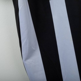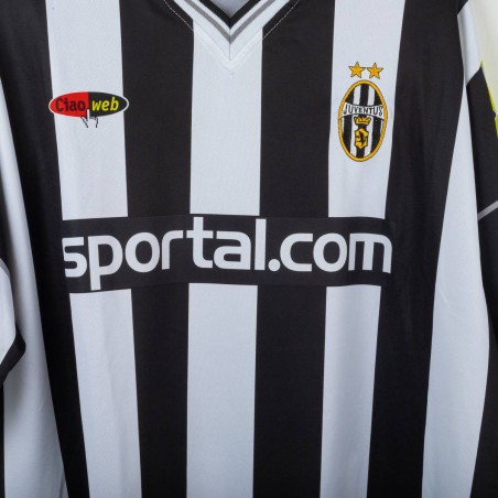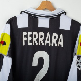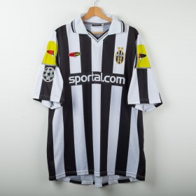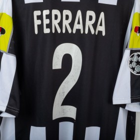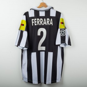 Maglia home della Juventus stagione 2000/2001, prodotta da Lotto per la UEFA Champions League. Classica a strisce bianconere con sponsor Sportal.com applicato sul petto. Stemma Juventus ricamato lato cuore con due stelle e patch Champions League sulla manica destra. Nome e numero Ferrara 2 applicati sul retro. Colletto a polo con bottoni, inserti grigi sui bordi. Taglia XL.