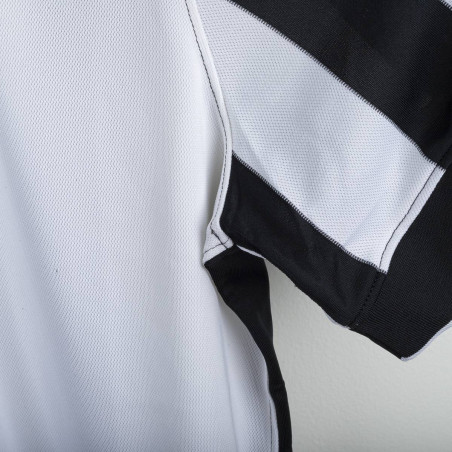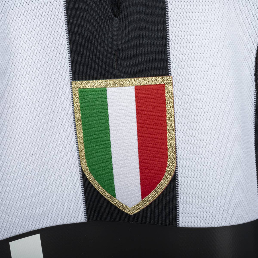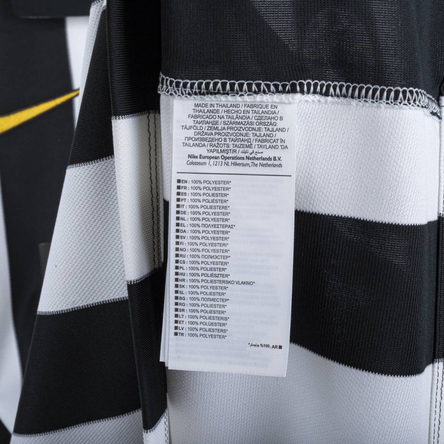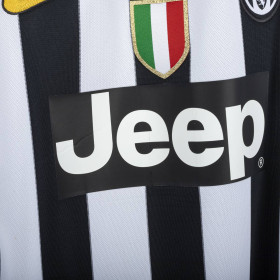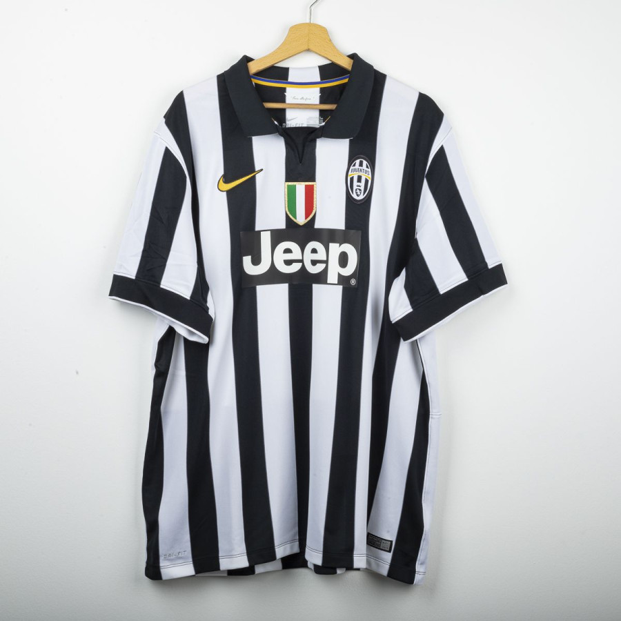 Maglia home della Juventus indossata nella stagione 2014/2015, prodotta da Nike. Classiche strisce bianconere con colletto polo nero. Stemma Juventus cucito lato cuore e swoosh Nike ricamato in giallo lato destro. Scudetto tricolore applicato al centro del petto con bordatura dorata. Sponsor Jeep stampato in bianco su sfondo nero. Nome Tevez e numero 10 applicati in stampa nera sul retro. Dettaglio interno al colletto con scritta “Fino alla fine”. Vestibilità regolare. Taglia XXL.