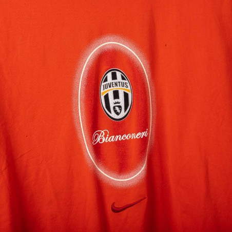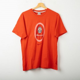 T-shirt Juventus Nike 2007/2008. Realizzata dal marchio tecnico Nike, la maglia presenta il logo del club in evidenza al centro, con la scritta “Bianconeri” e lo swoosh Nike posizionato in basso. La maglia è completamente arancione, con taglio semplice e maniche corte. Taglia M.