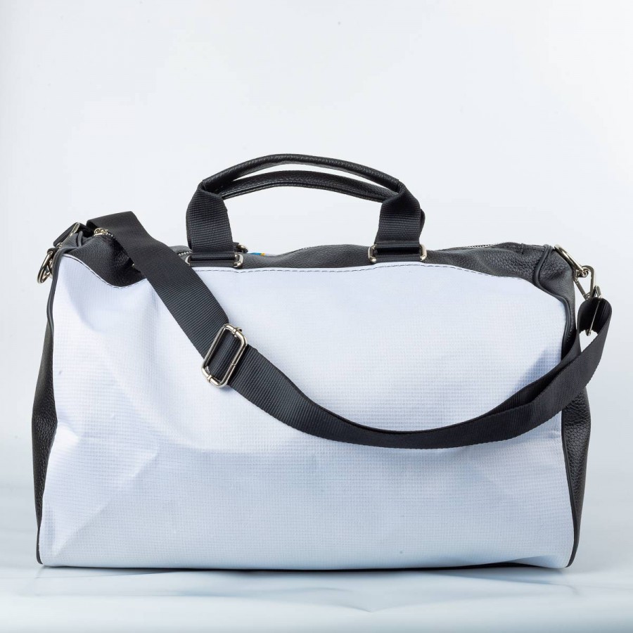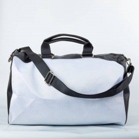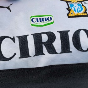 Borsone artigianale realizzato con la maglia originale della Lazio stagione 1999/2000, trasformata in un accessorio unico in simil pelle. Il fronte riprende fedelmente il design della divisa Puma bianca con dettagli celesti e gialli, sponsor Cirio e stemma celebrativo del centenario ricamato. Dotato di manici rinforzati e tracolla regolabile. Schienale in simil pelle nera, interno foderato.