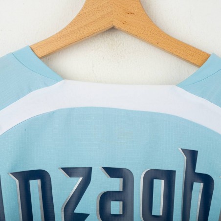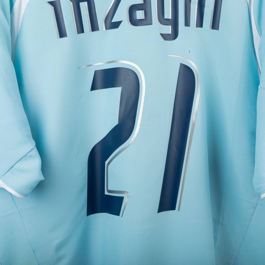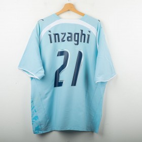 Maglia home della S.S. Lazio indossata nella stagione 2006/2007, prodotta da Puma. Colore celeste con inserti bianchi su spalle e bordi maniche. Stemma S.S. Lazio cucito lato cuore, loghi Puma ricamati in blu su petto e maniche. Sponsor INA Assitalia in stampa blu sul fronte con grafica tono su tono. Sul retro, nome “Inzaghi” e numero 21 in blu con bordatura bianca. Tessuto tecnico leggero con lavorazione a trama sottile. Taglia XXL.