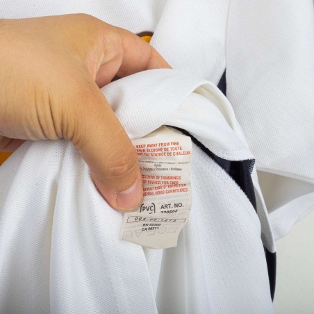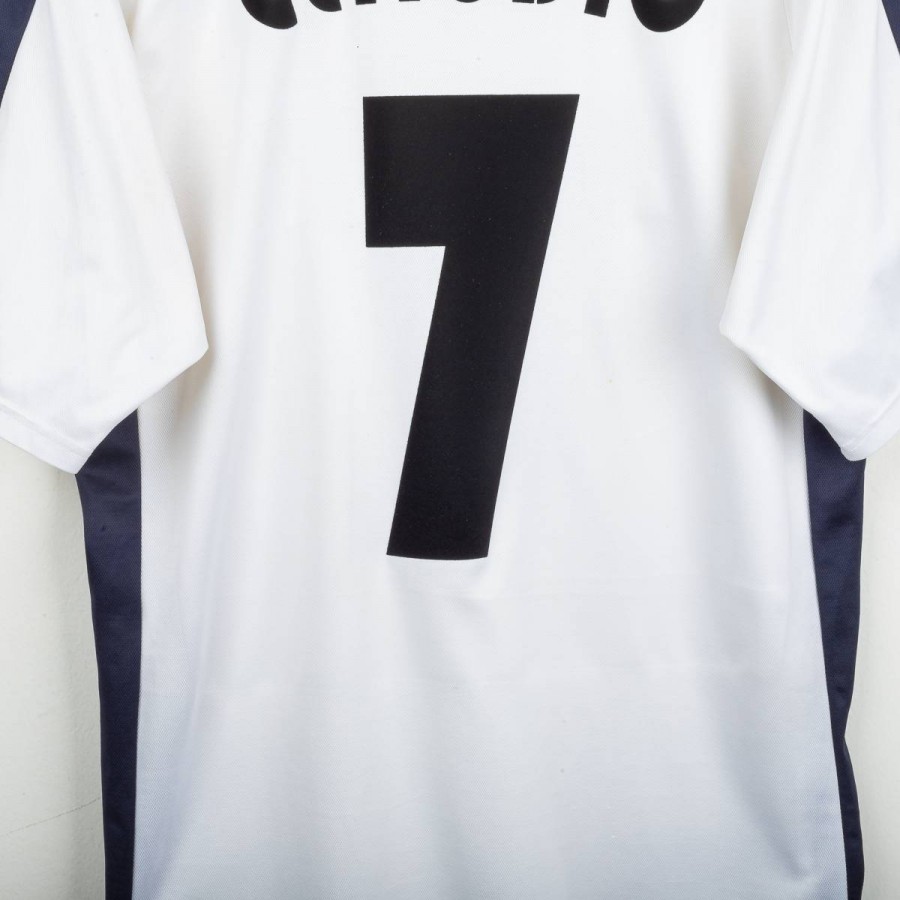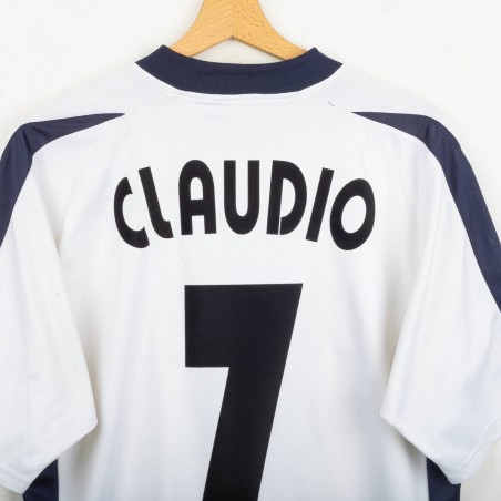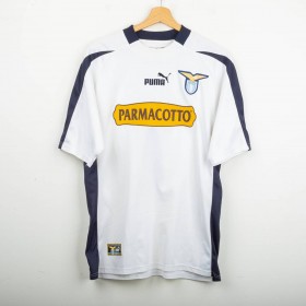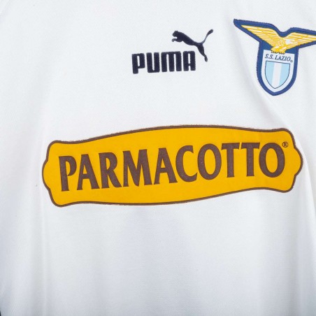 Maglia away della Lazio utilizzata nella stagione 2003/2004, prodotta da Puma. Colore bianco con inserti laterali blu navy e colletto a costina. Sponsor tecnico Puma cucito sul petto, sponsor Parmacotto applicato in stampa, stemma Lazio cucito lato cuore. Nome Claudio e numero 7 applicati sul retro in flock. Vestibilità regolare. Taglia L.