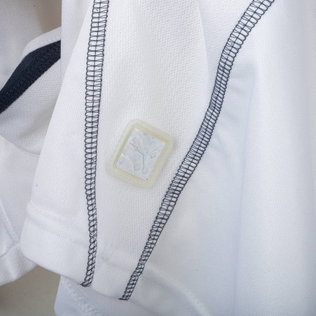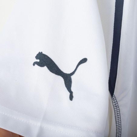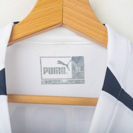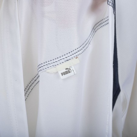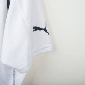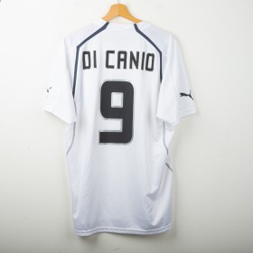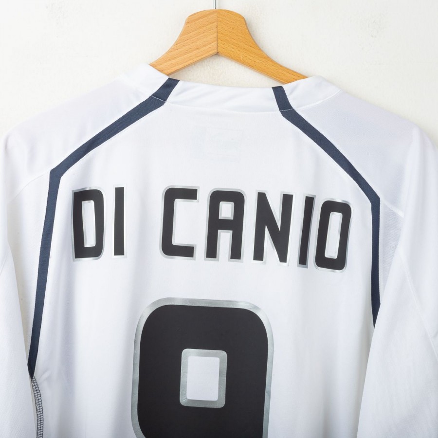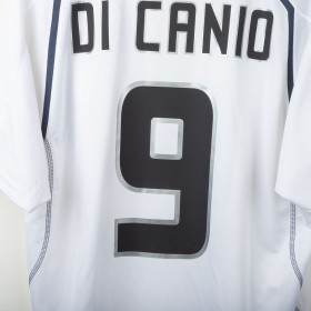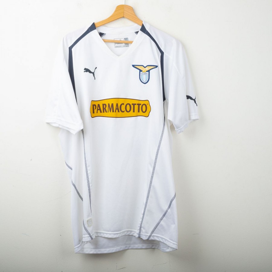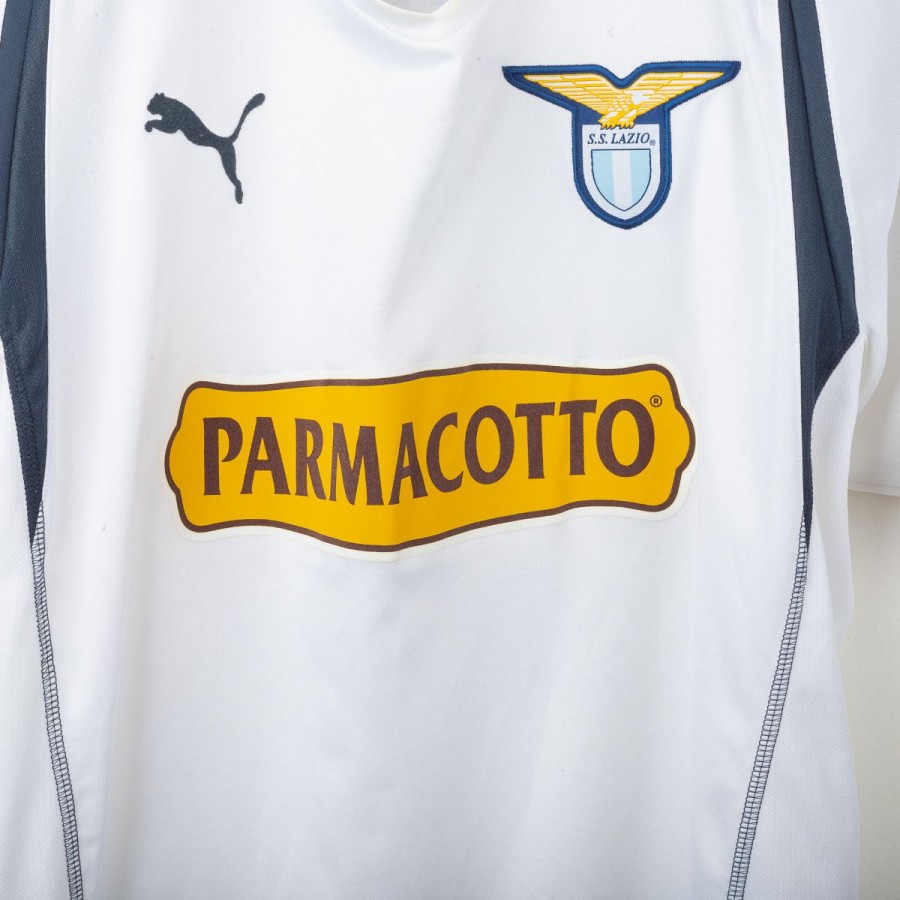 Maglia away Lazio della stagione 2004/2005, prodotta da Puma. Design bianco con inserti laterali blu navy. Sponsor centrale “Parmacotto” stampato. Logo Puma ricamato sul petto destro e stemma Lazio cucito lato cuore. Colletto a V bianco. Maniche corte con logo Puma sulle spalle. Sul retro personalizzazione ufficiale “Di Canio 9”. Taglia XL. Prodotto ufficiale Puma, fornitore tecnico Lazio nei primi anni 2000.
