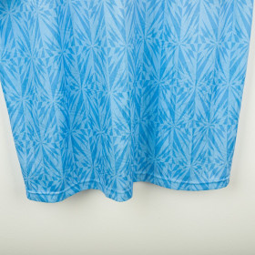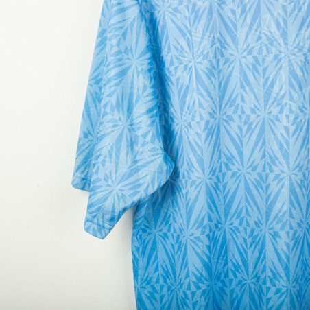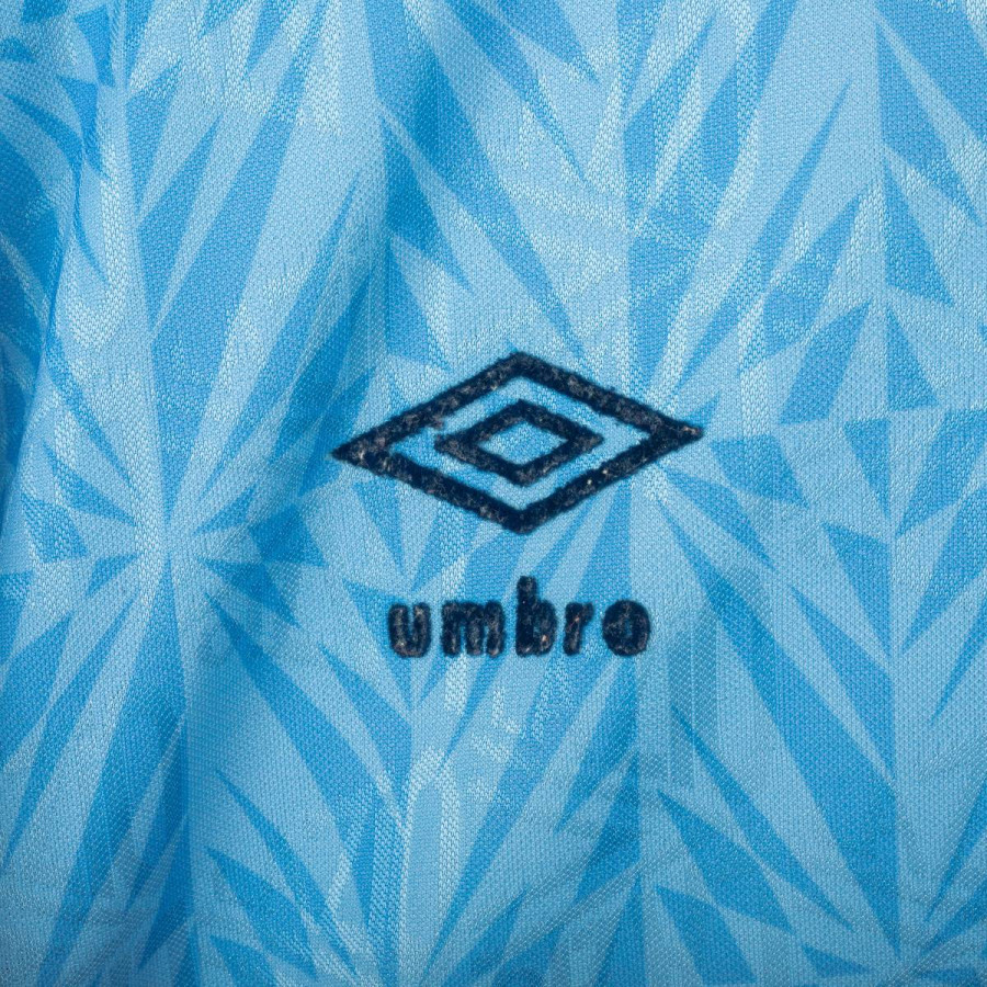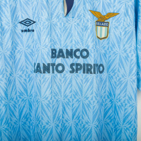 Maglia home della S.S. Lazio utilizzata nella stagione 1991/1992, prodotta da Umbro. Colore celeste con pattern geometrico tono su tono e colletto in stile polo con chiusura a bottone. Logo Umbro ricamato sul petto destro, stemma Lazio applicato lato cuore e sponsor Banco Santo Spirito stampato al centro. Realizzata in poliestere lucido, con vestibilità regolare. Prodotta in Inghilterra, simbolo di una delle maglie più iconiche della Lazio anni '90. Taglia L.