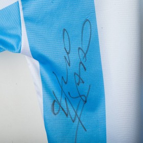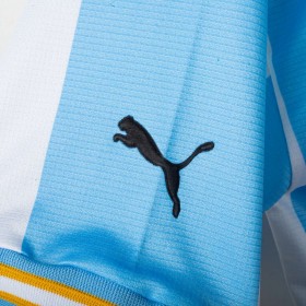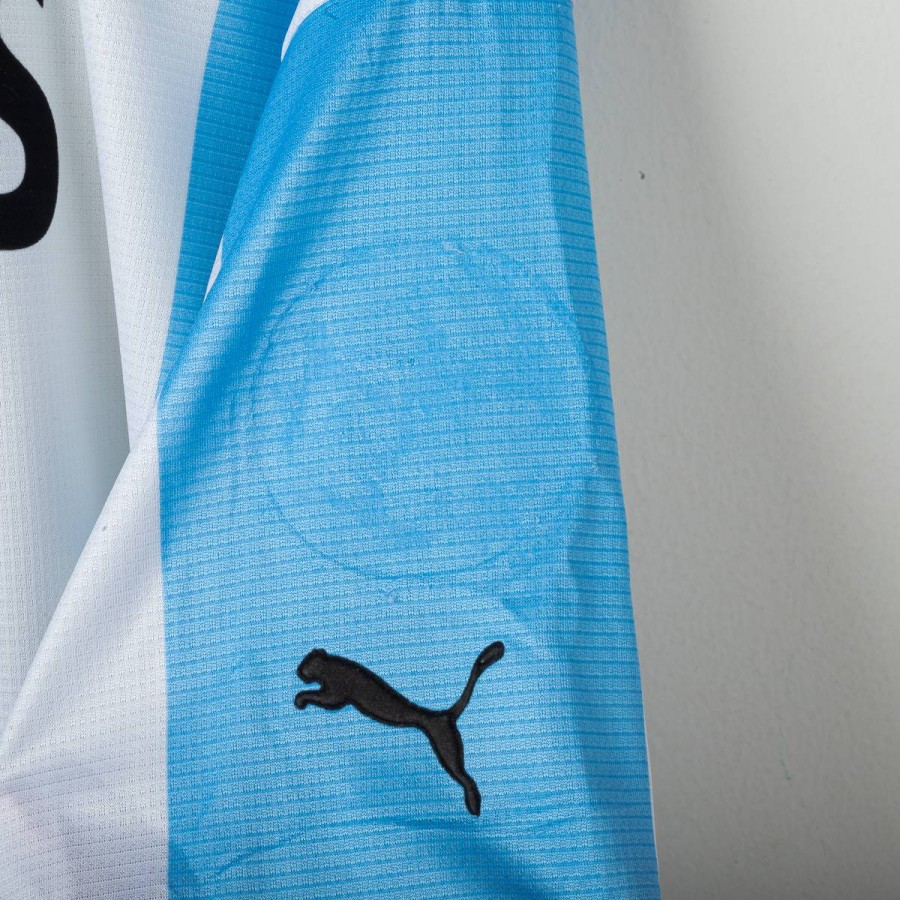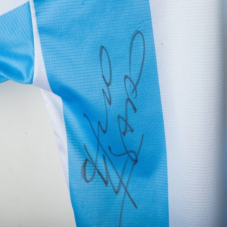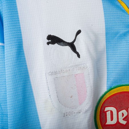 Maglia special edition della Lazio stagione 1999/2000, realizzata da Puma e personalizzata con nome Salas e numero 9. Modello con strisce verticali bianco-celesti, sponsor centrale Del Monte, logo Puma e stemma Lazio ricamati sul petto. Segni visibili di patch rimosse. Firma di Marcelo Salas sulla manica destra. Colletto a polo con bordo giallo. Vestibilità ampia, taglia XXL.