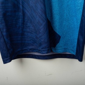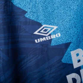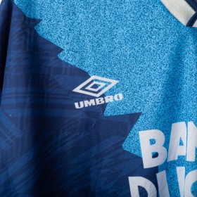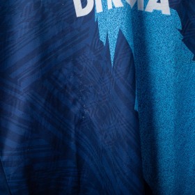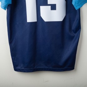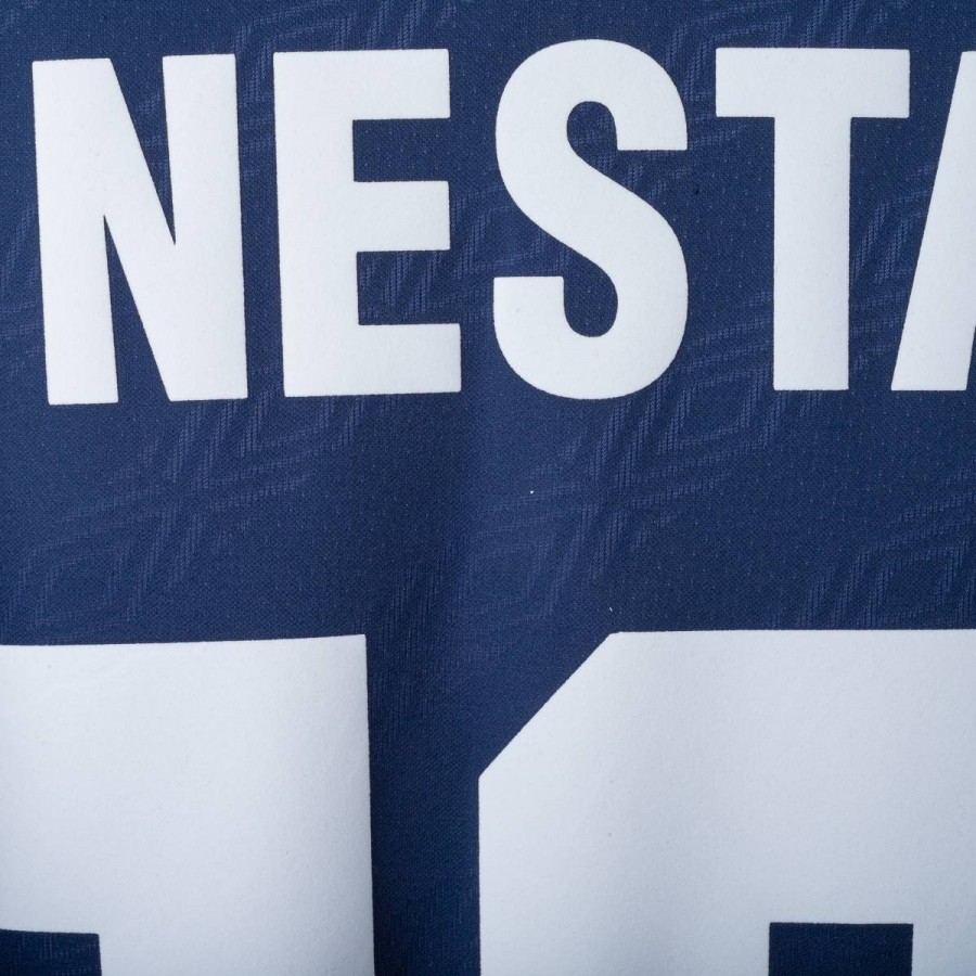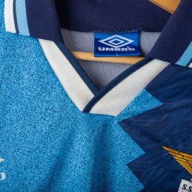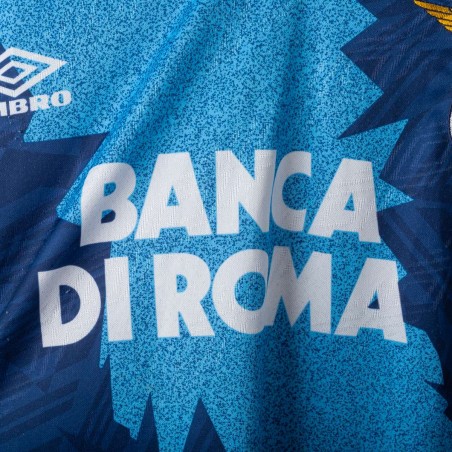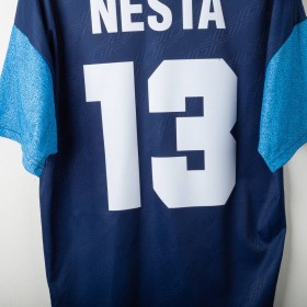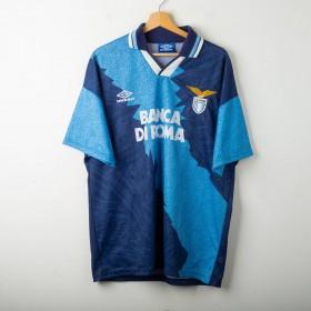 Maglia third della S.S. Lazio della stagione 1994/1995, prodotta da Umbro. Design audace con grafica astratta azzurra su base blu navy, sponsor Banca di Roma stampato in bianco in sublimatico. Colletto a V bicolore blu e bianco. Logo Umbro stampato e stemma Lazio cucito sul petto. Personalizzazione Nesta n°13 sul retro in bianco in flock. Tessuto con motivo geometrico tono su tono. Taglia L, maniche corte.