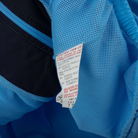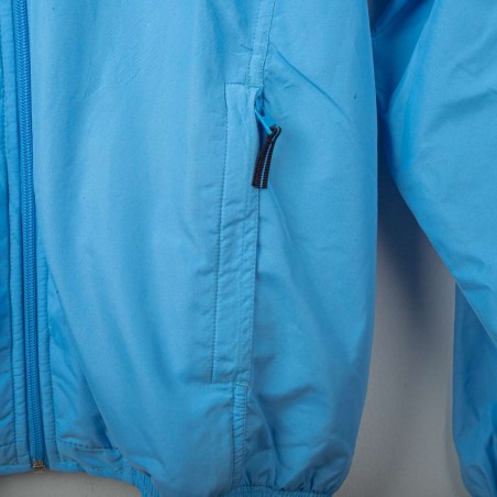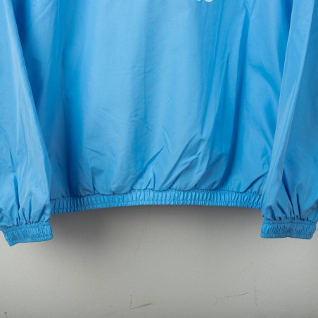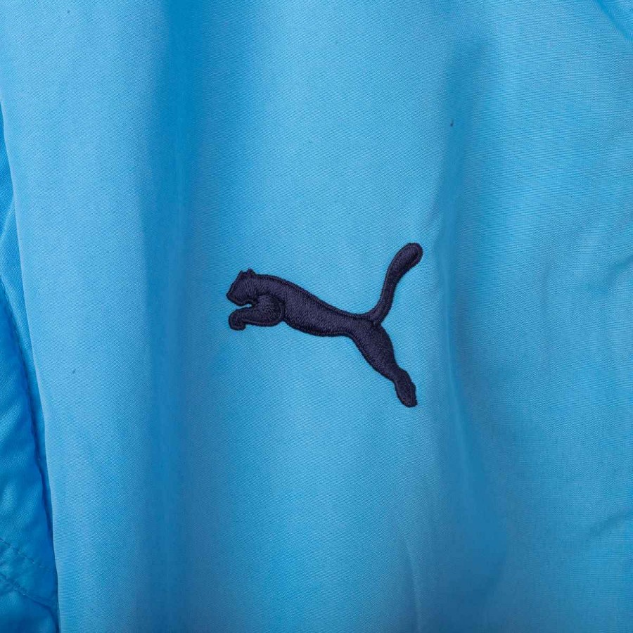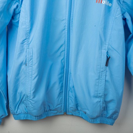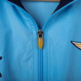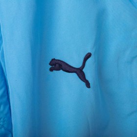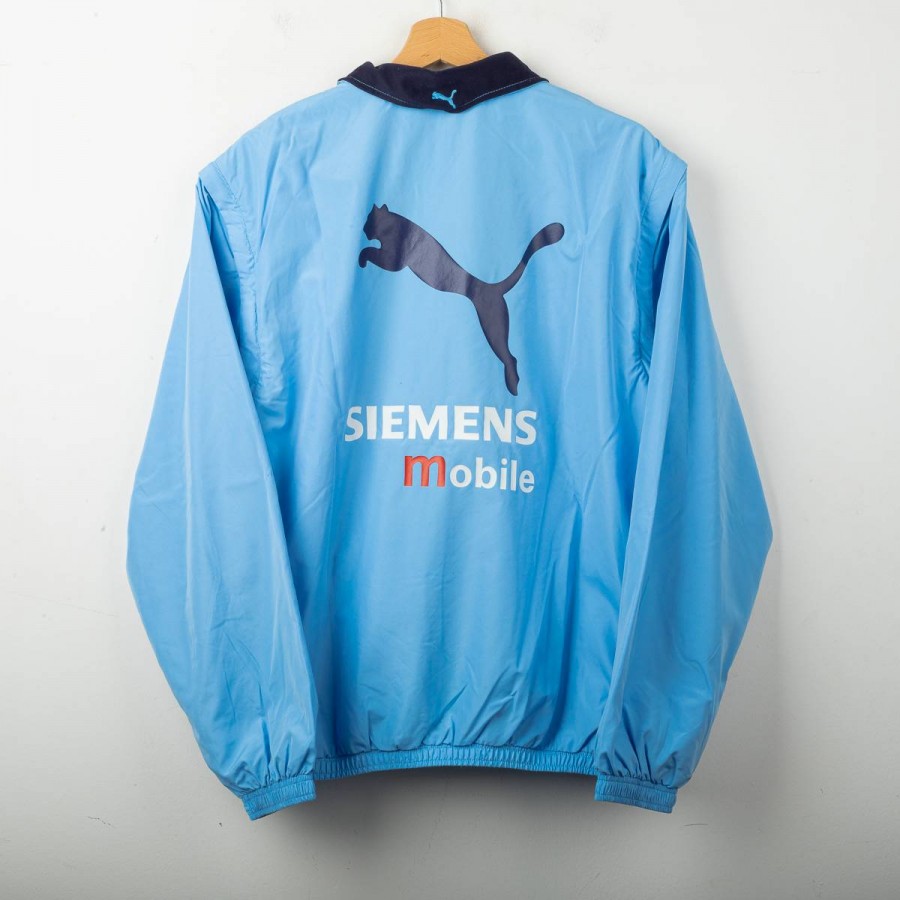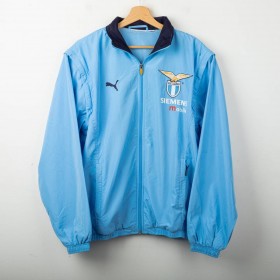 Giacca da rappresentanza della Lazio indossata nella stagione 2000/2001 e prodotta da Puma. Modello in tessuto leggero color celeste con dettagli navy sul colletto e logo Puma nero sul petto e sulla schiena. Stemma della S.S. Lazio cucito lato cuore e sponsor Siemens Mobile stampato fronte e retro. Chiusura full zip e tasche laterali con zip. Interno in mesh traspirante. Vestibilità regolare. Taglia L.