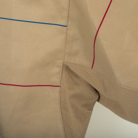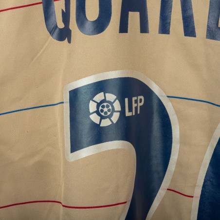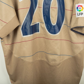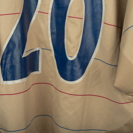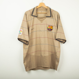 Maglia away del Barcellona indossata nella stagione 2003/2004, prodotta da Nike. Modello color oro con sottili righe orizzontali rosse e blu, colletto a V e dettagli blu navy. Logo Nike ricamato sul petto destro e stemma FC Barcelona cucito lato cuore. Patch ufficiale LFP sulla manica destra. Nome e numero Quaresma 20 applicati sul retro in stampa ufficiale della Liga. Realizzata in poliestere tecnico con inserti in mesh laterali per una migliore traspirazione. Taglia XL.