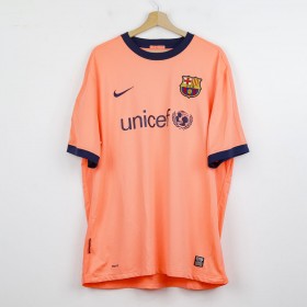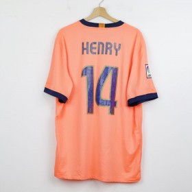 Maglia da trasferta ufficiale del Barcellona per la stagione 2009/2010, prodotta dallo sponsor tecnico Nike e con il logo dell'organizzazione benefica UNICEF come sponsor commerciale. Questa maglia presenta un vibrante colore arancione con dettagli in blu scuro su colletto e bordo maniche, donandole un aspetto moderno e accattivante. Sul petto, il logo del Barcellona è applicato lato cuore, con il marchio Nike a destra e il logo UNICEF in blu scuro al centro. Sul retro, personalizzazione con il nome "HENRY" e il numero 14, in riferimento al leggendario Thierry Henry, in blu scuro con contorno.