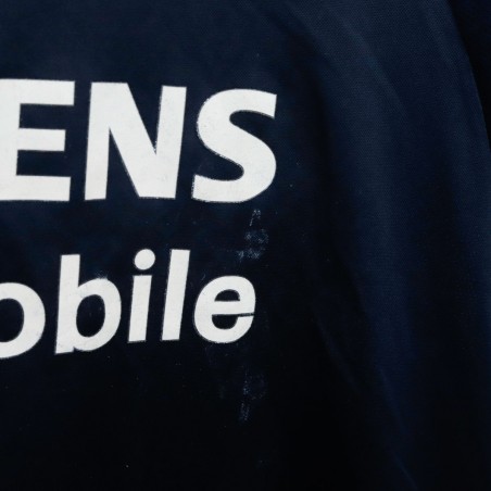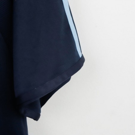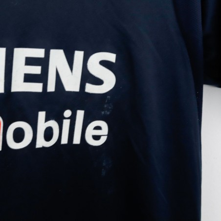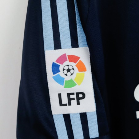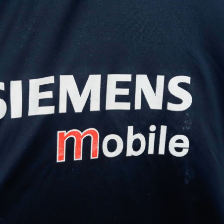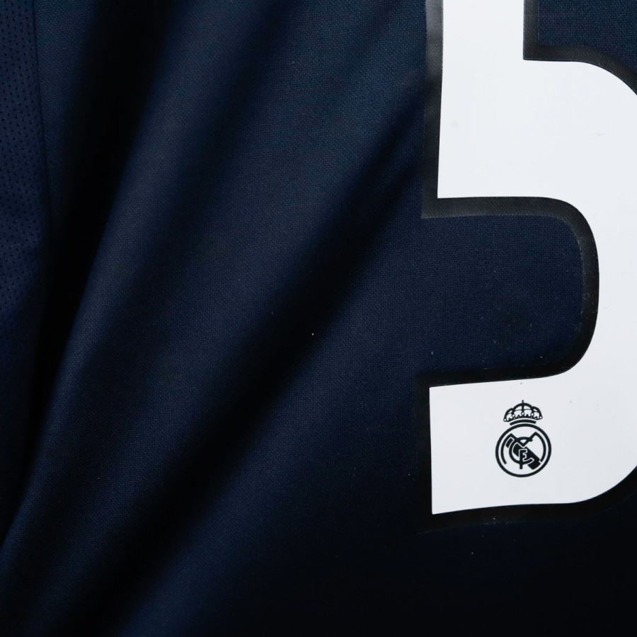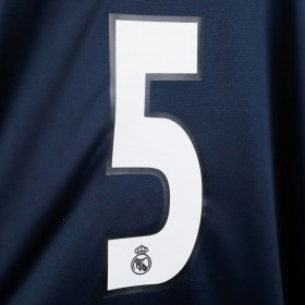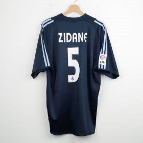 Maglia Away Real Madrid Adidas Zidane 5 2003/2004. Realizzata da Adidas per la stagione 2003/2004, questa maglia da trasferta del Real Madrid presenta una tonalità blu notte con dettagli celesti lungo le spalle e il colletto. Sul fronte compaiono lo sponsor tecnico Adidas e quello commerciale Siemens Mobile, mentre sulla manica destra è applicata la patch della Liga. Il retro della maglia è dedicato al leggendario numero 5 Zinedine Zidane, simbolo dell'epoca dei Galácticos.