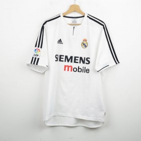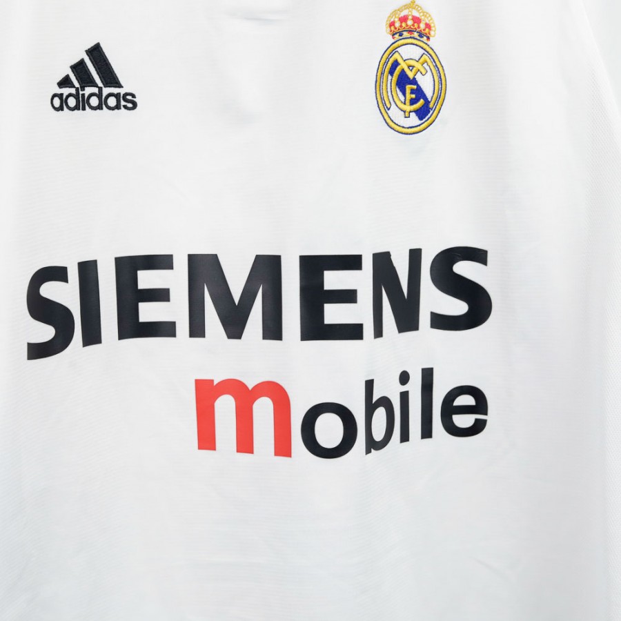 Maglia Home Real Madrid 2003/2004 indossata da Roberto Carlos con il numero 3. Realizzata da Adidas, presenta il logo del club ricamato sul petto e lo sponsor commerciale Siemens Mobile ben visibile al centro della maglia. Le tre strisce Adidas sono applicate sulle maniche, mentre sul retro campeggia il nome “R. Carlos” con il numero 3 in nero bordato di giallo. La taglia è M.