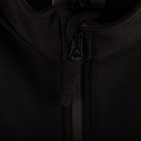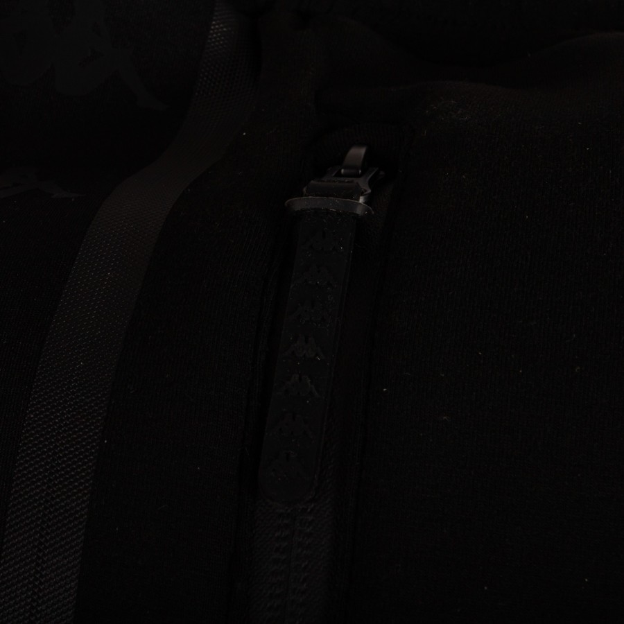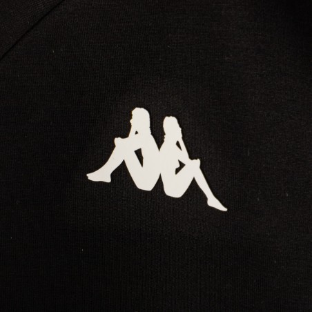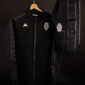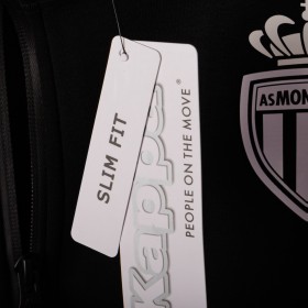 Modello Di colore nero, completa di pantalone e felpa full zip. Lato cuore stemma AS Monaco termo applicato in bianco, sulla destra logo Kappa. Lateralmente presenta un pattern del logo Kappa.