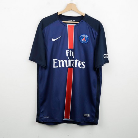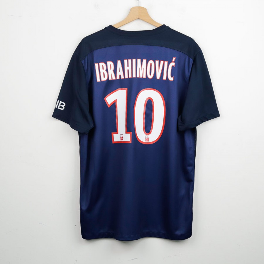 Maglia Home PSG Nike Ibrahimovic 10 2014/2015. Realizzata da Nike, presenta il logo tecnico sul petto e lo sponsor commerciale Fly Emirates al centro della maglia. Sul retro è presente il nome e numero di Zlatan Ibrahimović, il celebre numero 10 del club parigino. La taglia indicata è XL.