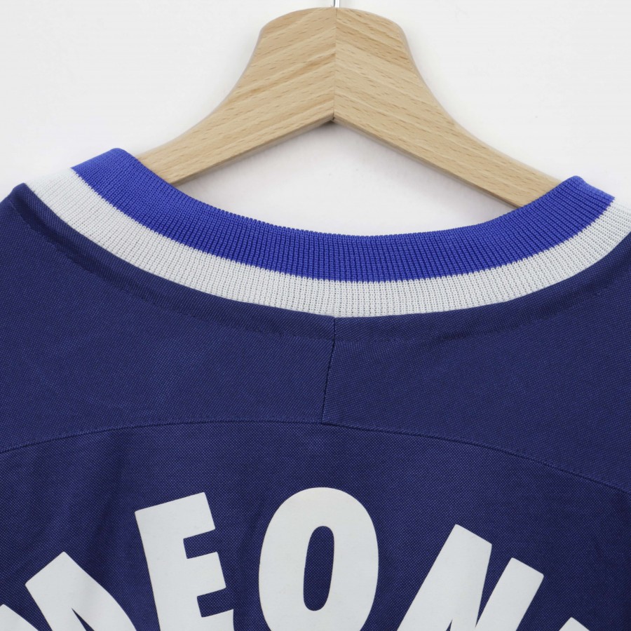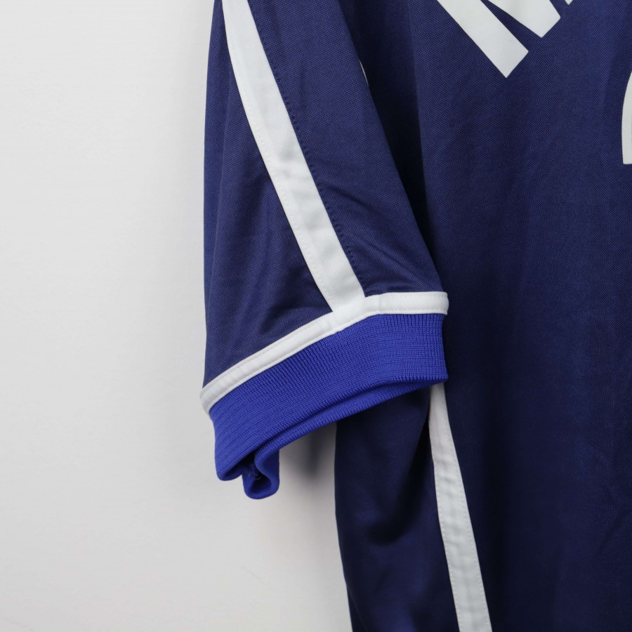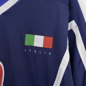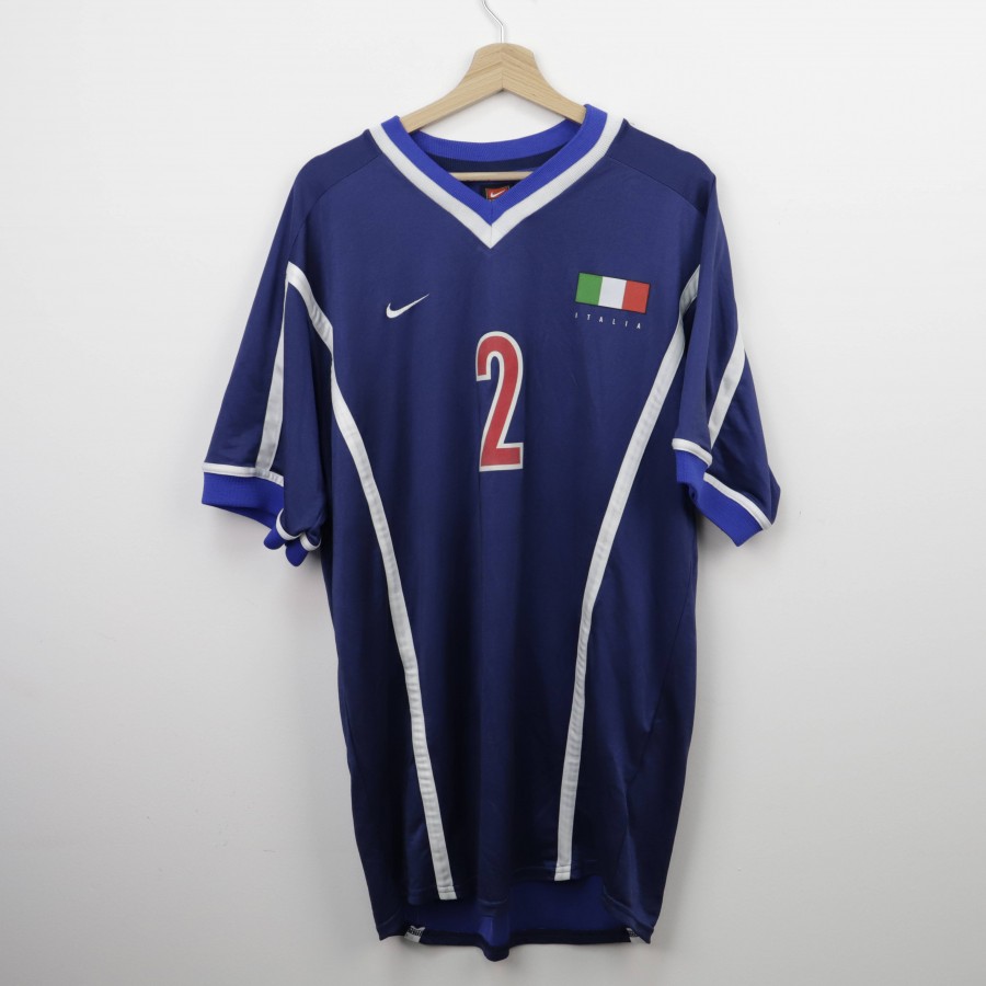 Maglia Home Italia Nike Meoni 2 indossata durante il Mondiale di Francia 1998. La maglia si presenta nel classico azzurro della Nazionale con inserti bianchi lungo i fianchi e le maniche. Sul fronte spicca il numero 2 in rosso bordato di bianco, accompagnato dal tricolore con la scritta "Italia" e dal logo Nike ricamato. Sul retro è riportata la personalizzazione "Meoni 2".