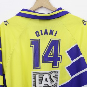 Maglia Home Las Daytona Modena Volley 1996/1997 indossata da Andrea Giani, numero 14. Prodotta da Asics, presenta il caratteristico design giallo con dettagli blu e loghi laterali. Sul fronte sono visibili gli sponsor LAS e Ceramiche Daytona, mentre sul retro è stampato il nome Giani sopra il numero 14. Modello storico del volley italiano, appartenuto a una delle stagioni più iconiche della pallavolo modenese.