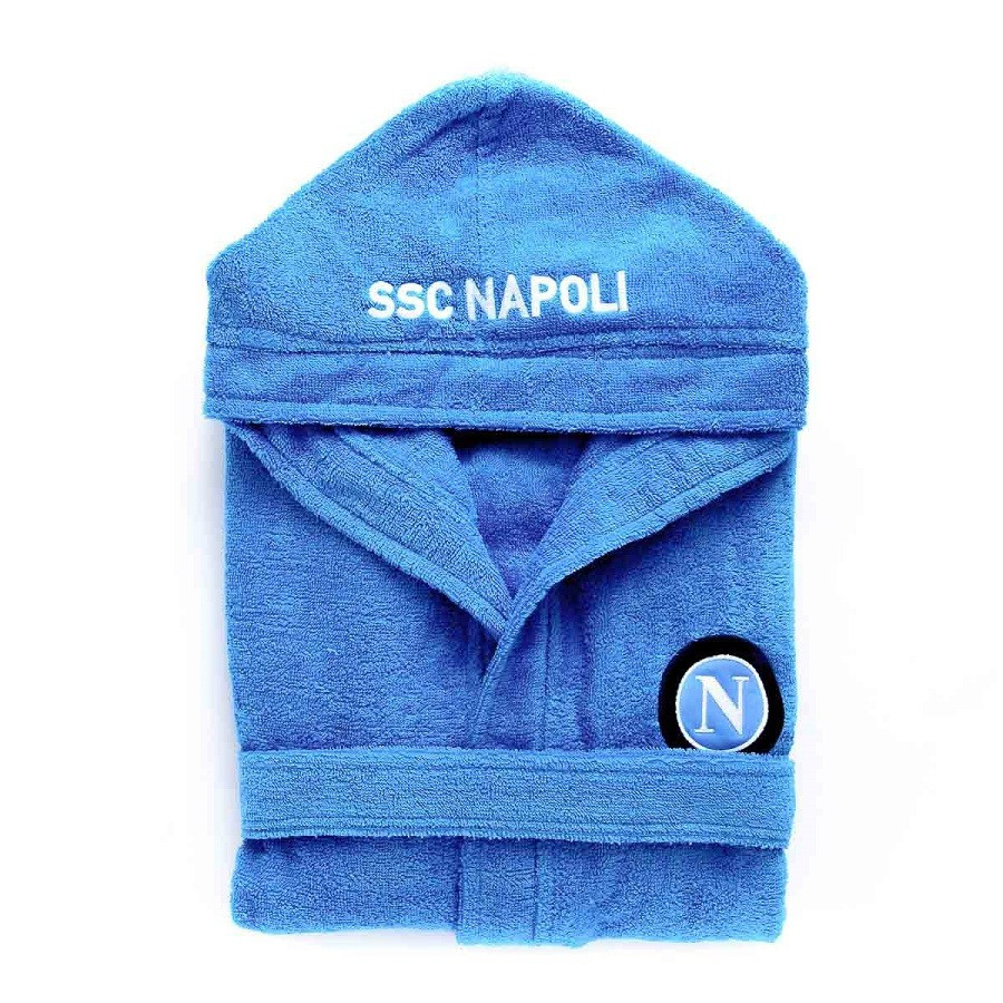 Accappatoio ufficiale SSC Napoli per bambino realizzato in morbida spugna di cotone azzurra. Presenta la scritta “SSC NAPOLI” ricamata sul cappuccio e il logo del club applicato sul petto. Dotato di cintura in vita e cappuccio per maggiore comfort e assorbenza. Perfetto per l'uso quotidiano o dopo l'attività sportiva, per i piccoli tifosi azzurri.