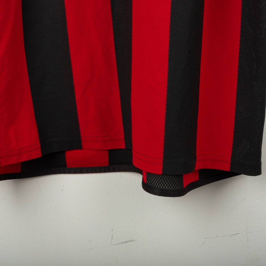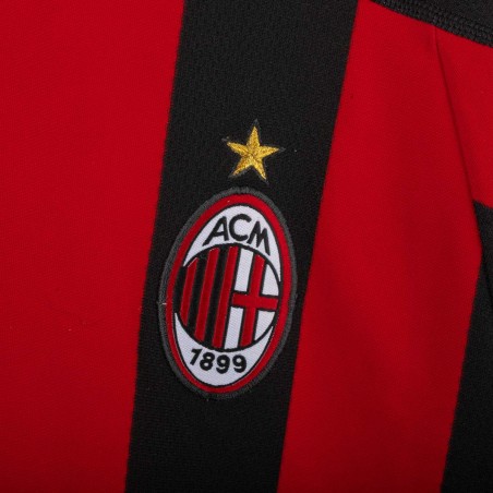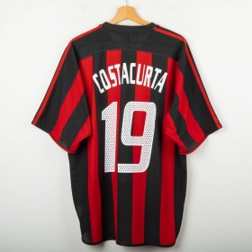 Maglia home del Milan utilizzata nella stagione 2003/2004, prodotta da Adidas. Classica colorazione rossonera a strisce verticali, con dettagli rossi su spalle e maniche. Logo Adidas ricamato sul petto destro, stemma del Milan cucito lato cuore con stella dorata superiore. Sponsor Opel Meriva al centro. Nome Costacurta e numero 19 sul retro. Vestibilità regolare. Taglia XL.