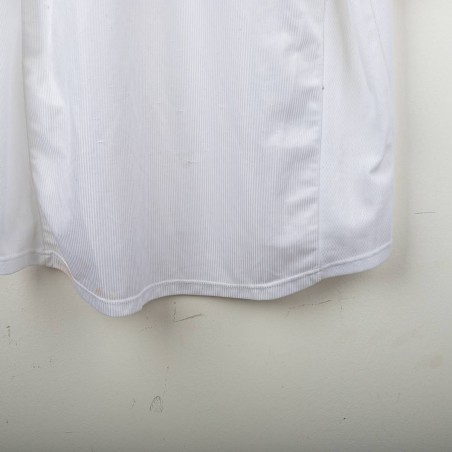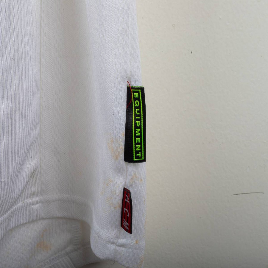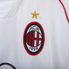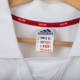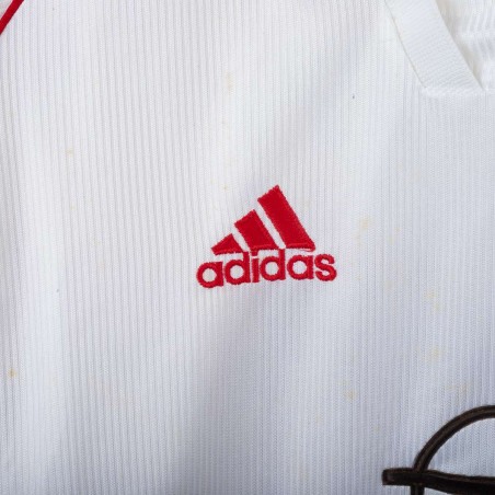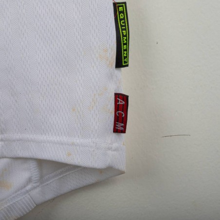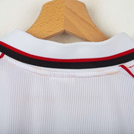 Maglia away del Milan utilizzata durante la stagione 1998/1999, prodotta da Adidas. Colore bianco con dettagli rossi e neri. Logo Adidas ricamato e sponsor Opel applicato in flock. Stemma del Milan cucito lato cuore con stella dorata superiore. Patch celebrativa del centenario (1899-1999) applicata sulla manica destra. Numero 16 sul retro. Colletto a polo con profilo rosso-nero. Vestibilità regolare, taglia XL.