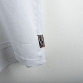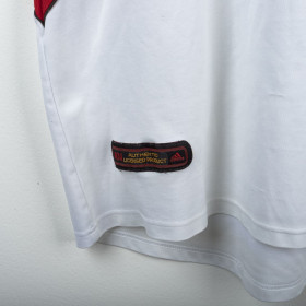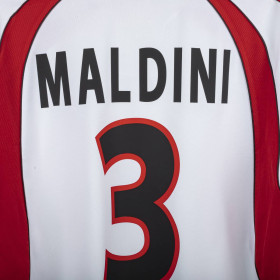Maglia away del Milan indossata nella stagione 2001/2002, prodotta da Adidas. Design bianco con inserti rossi sui lati e sulle spalle. Colletto a polo bianco con apertura a V. Stemma Milan cucito lato cuore e logo Adidas ricamato in nero sul lato destro. Sponsor Opel applicato in flock nero al centro del petto. Nome Maldini e numero 3 applicati in stampa nera con bordatura rossa sul retro. Taglio classico, vestibilità regolare. Taglia L.