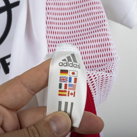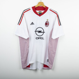 Maglia away dell'AC Milan indossata nella stagione 2002/2003, prodotta da Adidas. Design bianco con dettagli rossi e neri su colletto e spalle, inserti in mesh laterali. Stemma del Milan cucito lato cuore con stella dorata sovrastante, logo Adidas ricamato lato destro. Sponsor Opel stampato al centro del petto. Nome Rivaldo e numero 11 applicati in stampa nera sul retro. Colletto a V. Vestibilità regolare. Taglia L.
