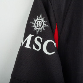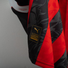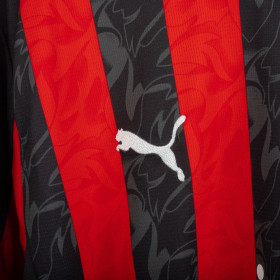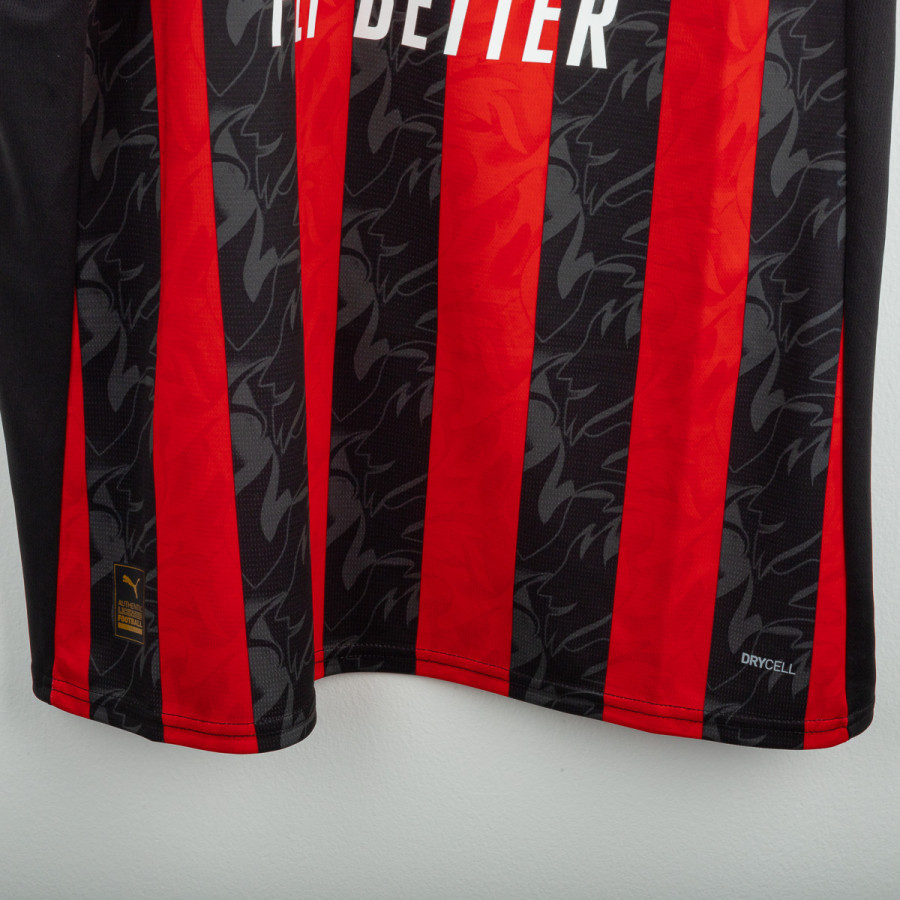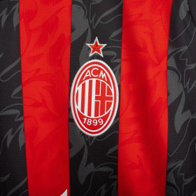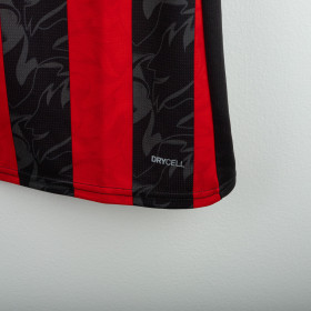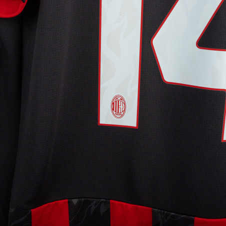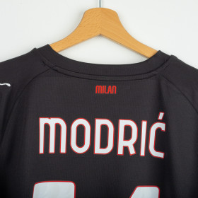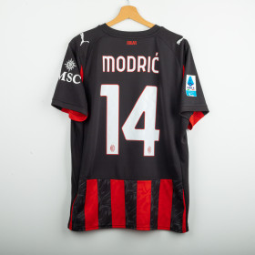 Maglia home del Milan utilizzata nella stagione 2025/2026, prodotta da Adidas. Classica colorazione rossonera con bande verticali nere e rosse. Logo Adidas ricamato sul petto destro e stemma del club cucito lato cuore. Sponsor principale applicato in stampa liscia al centro. Nome e numero Modric 14 sul retro. Colletto a V e inserti in mesh laterali per garantire traspirabilità e comfort. Vestibilità slim fit. Taglia XL.