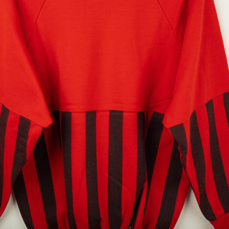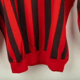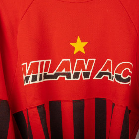Felpa girocollo del Milan risalente alla stagione 1991/1992, prodotta da Le Felpe. Colore rosso con parte inferiore e maniche a righe verticali rossonere. Logo frontale MILAN A.C. e stella gialla applicati in stampa flock. Stemma societario stampato sulla manica sinistra. Realizzata in misto cotone e acrilico, con tessuto caldo e morbido. Vestibilità comoda. Taglia M.