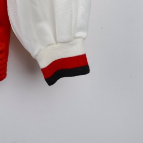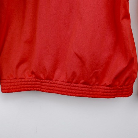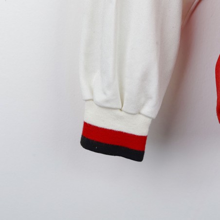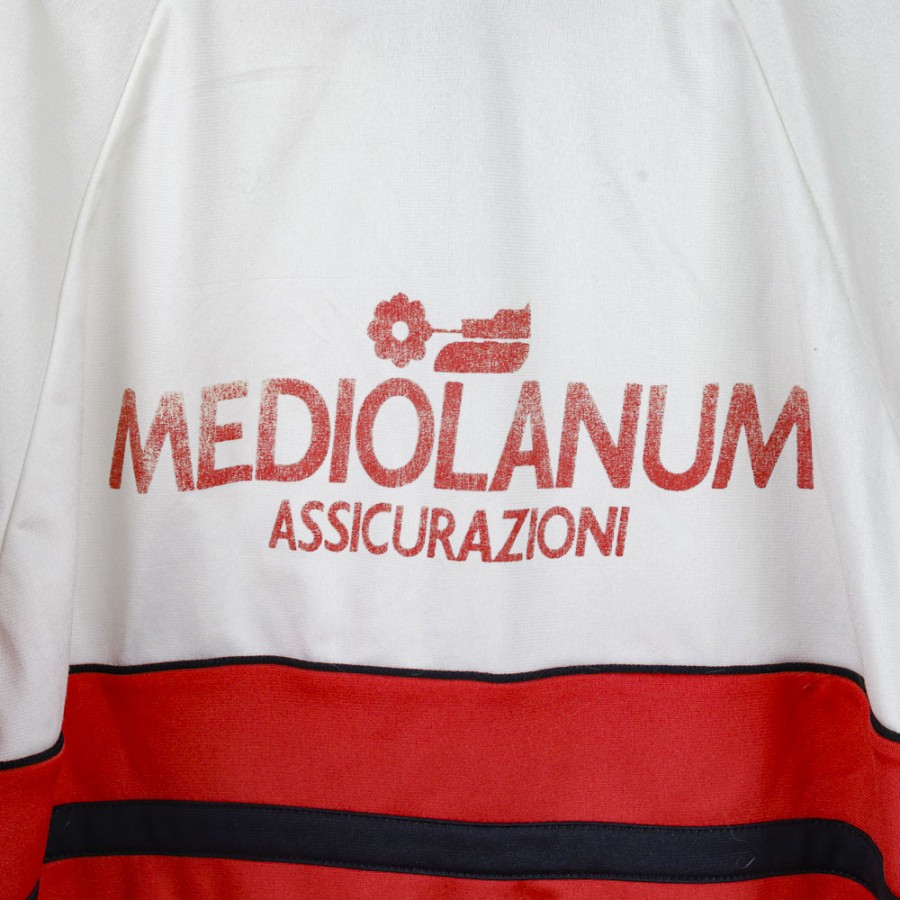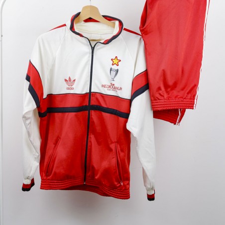 Tuta dell'AC Milan realizzata dallo sponsor tecnico Adidas per la stagione 1990/1991. Di colore rosso e bianco con dettagli neri presenta sul petto il simbolodella "Coppa dei Campioni" cucita sul lato del cuore con una stella ricamata come celebrazione alla competizione europea vinta l'anno precedente. Sotto si presenta lo sponsor commerciale Mediolanum Assicurazoni applicato che ritroviamo anche sul retro in dimensioni più grandi. Dal lato opposto invece il logo dello sponsor tecnico Adidas. Il pantalone è completamente rosso con logo adidas e le "three stripes" laterali alle gambe.