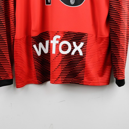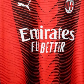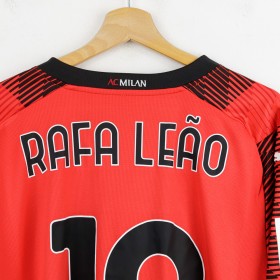Maglia home del Milan stagione 2023/2024 a maniche lunghe, realizzata da Puma. Il design moderno presenta un motivo grafico nero su base rossa con colletto a V nero. Sul fronte troviamo il logo Puma come sponsor tecnico e lo sponsor commerciale Emirates Fly Better. Sul retro sono applicati nome e numero di Rafa Leão in nero con bordi bianchi, il numero 10. Sulla manica destra è presente la patch ufficiale della Serie A. Taglia XL.