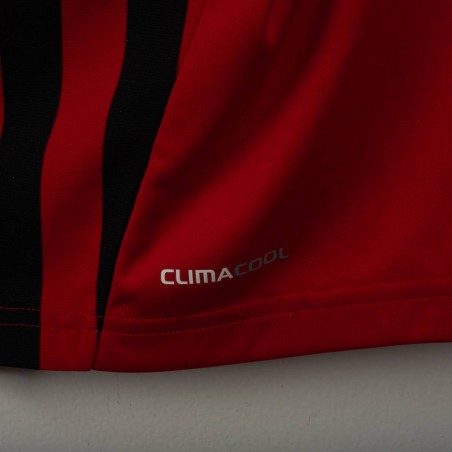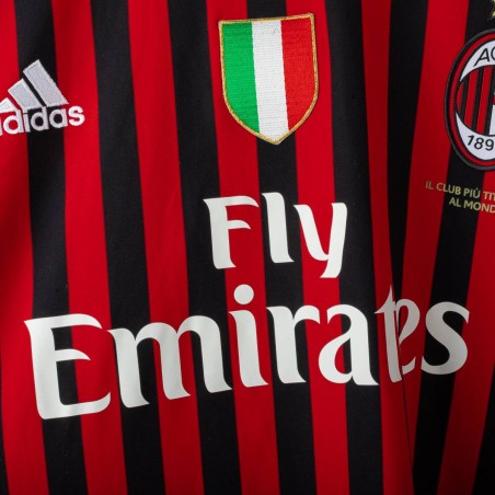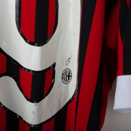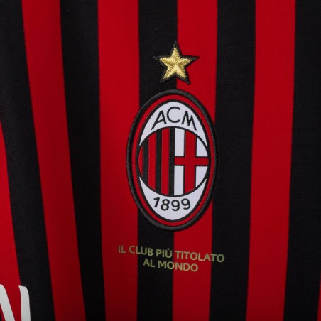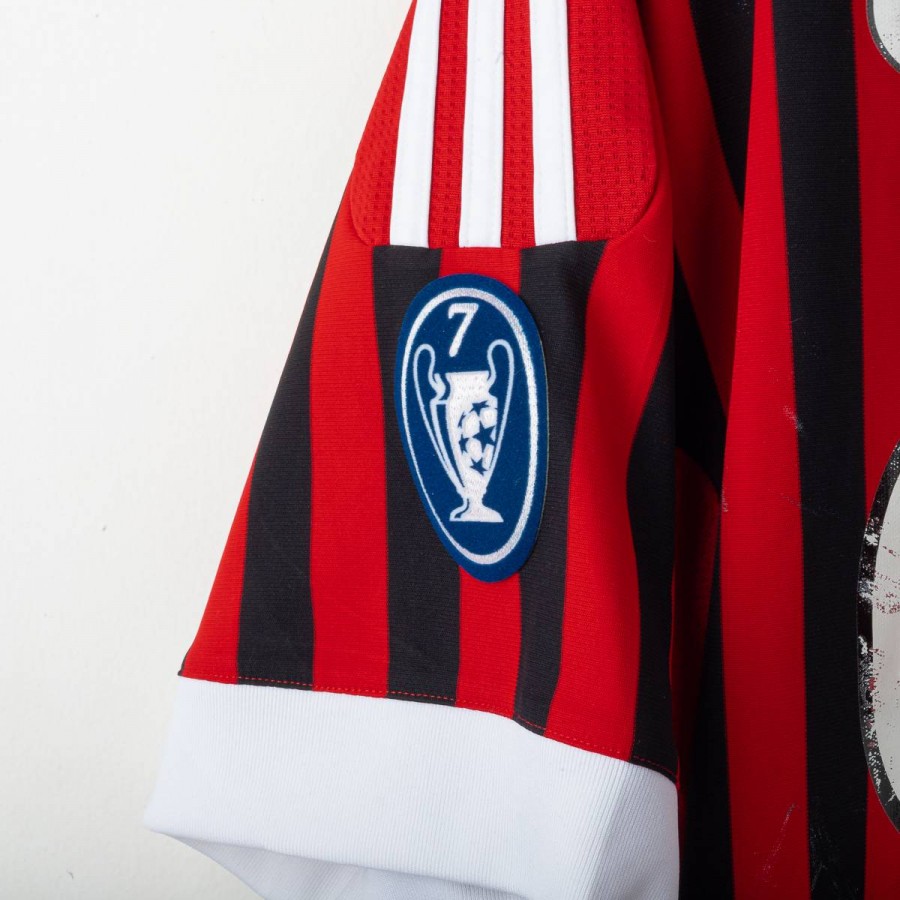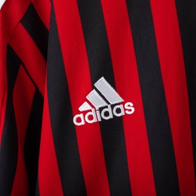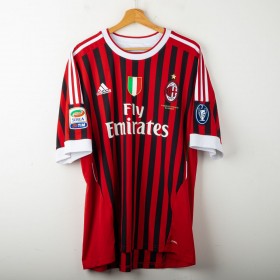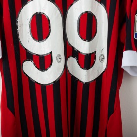 Maglia home del Milan stagione 2011/2012, realizzata da Adidas e personalizzata con nome Cassano e numero 99. Design a strisce verticali rosse e nere con dettagli bianchi. Presenti logo Adidas, stemma AC Milan con stella e scudetto tricolore al centro. Patch Serie A TIM sulla manica destra e patch 7 Champions League su quella sinistra. Colletto bianco a girocollo. Taglia XL.