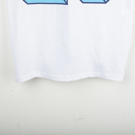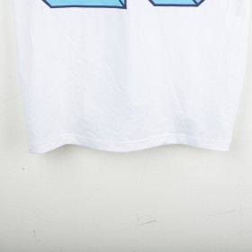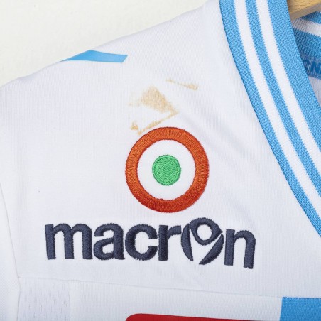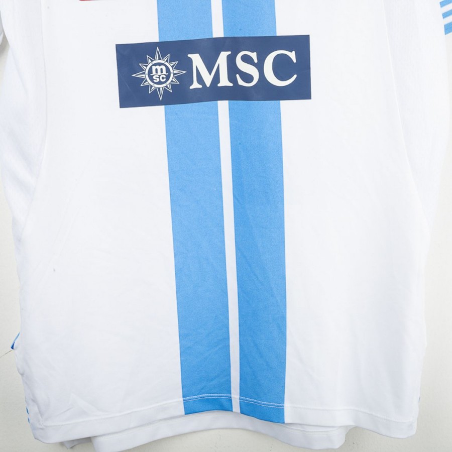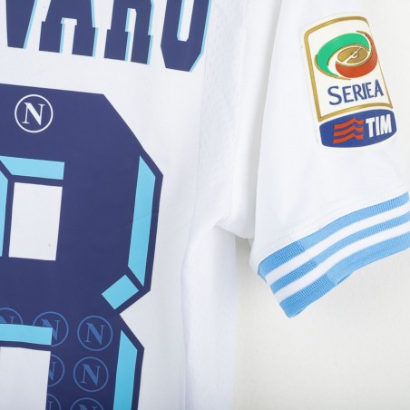 Maglia away del Napoli stagione 2012/2013, prodotta da Macron. Colore bianco con banda verticale celeste. Dettagli celesti su colletto e maniche. Sponsor tecnico Macron ricamato sul petto. Sponsor principali Lete e MSC applicati in stampa sublimatica. Stemma SSC Napoli cucito lato cuore. Patch Scudetto e Serie A applicate sulle maniche. Retro con nome Paolo Cannavaro e numero 28 in blu con motivo personalizzato con loghi SSC Napoli. Vestibilità regolare. Taglia M.