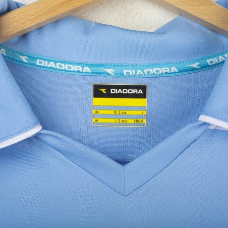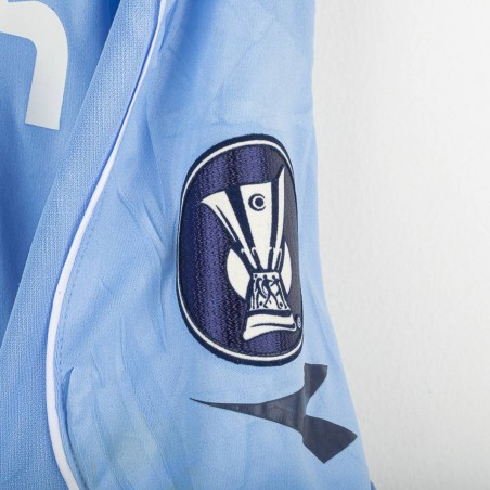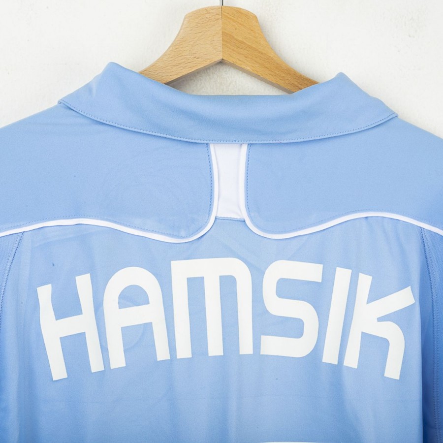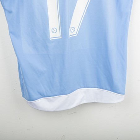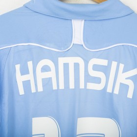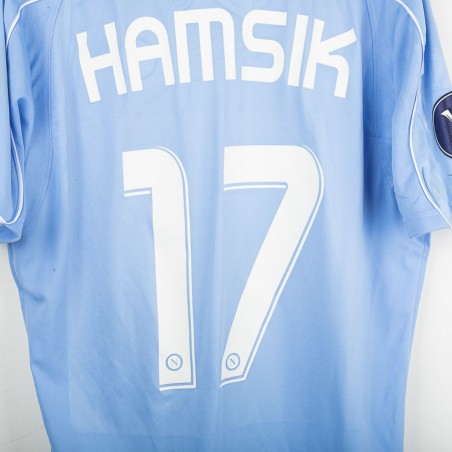 Maglia home del Napoli stagione 2008/2009, prodotta da Diadora e preparata per il match di Coppa UEFA Benfica - Napoli, terminato 3-2. Colore azzurro con dettagli bianchi su colletto e maniche. Sponsor tecnico Diadora applicato in stampa nera sul petto. Sponsor principale Lete applicato in stampa sublimatica al centro. Stemma SSC Napoli cucito lato cuore. Patch Coppa UEFA cucita sulla manica destra. Retro con nome Hamsik e numero 17 in stampa bianca. Maglia autografata sul fronte dal calciatore slovacco, protagonista assoluto di quegli anni. Vestibilità regolare. Taglia XL.