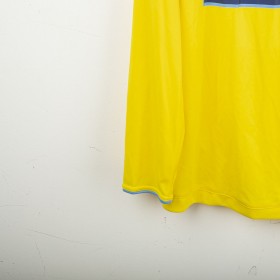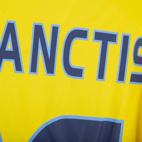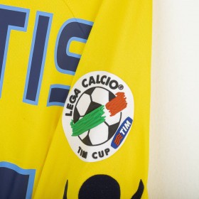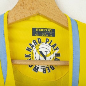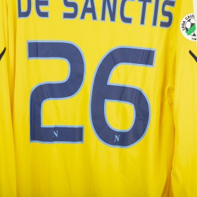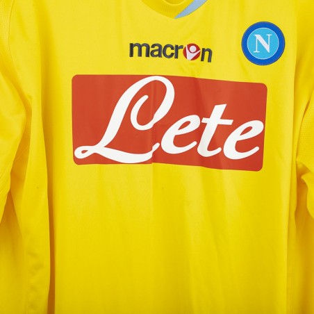 Maglia da portiere del Napoli stagione 2009/2010, prodotta da Macron. Colore giallo con dettagli celesti su colletto e bordi maniche. Sponsor tecnico Macron ricamato sul petto. Sponsor principale Lete applicato in stampa sublimatica al centro. Stemma SSC Napoli cucito lato cuore. Patch Lega Calcio TIM Cup cucita sulla manica destra. Retro con nome De Sanctis e numero 26 in stampa blu bordata di celeste. Versione a manica lunga. Vestibilità regolare. Taglia XXL.