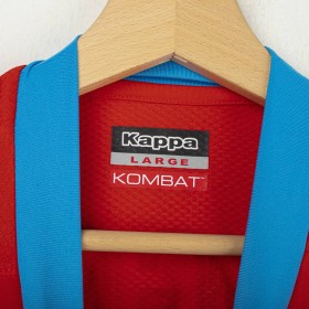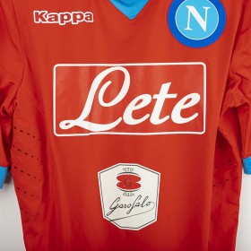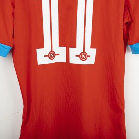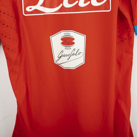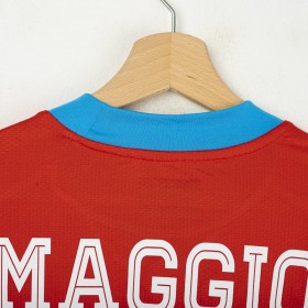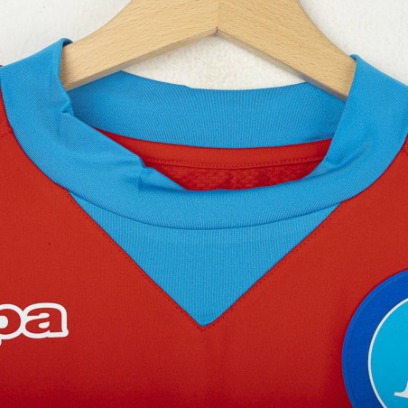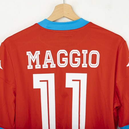 Maglia third del Napoli stagione 2015/2016, prodotta da Kappa, modello Kombat. Colore rosso con dettagli azzurri su colletto e bordo maniche. Sponsor tecnico Kappa applicato in stampa bianca sul petto e sulle maniche. Sponsor principali Lete e Garofalo applicati in stampa sublimatica al centro. Stemma SSC Napoli cucito lato cuore. Patch ufficiale Serie A TIM sulla manica destra. Retro con nome Maggio e numero 11 in stampa bianca. Vestibilità aderente tipica del modello Kombat. Taglia L. Maglia storica legata alla stagione con Maurizio Sarri, in cui Maggio fu una delle bandiere della squadra.