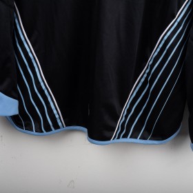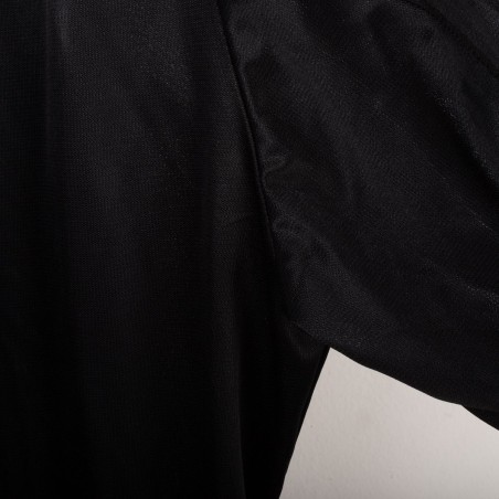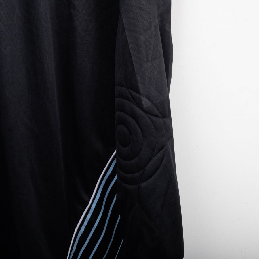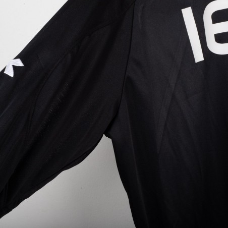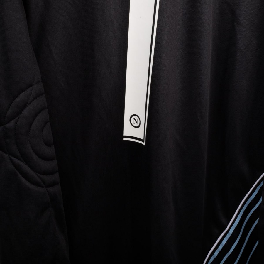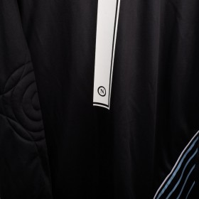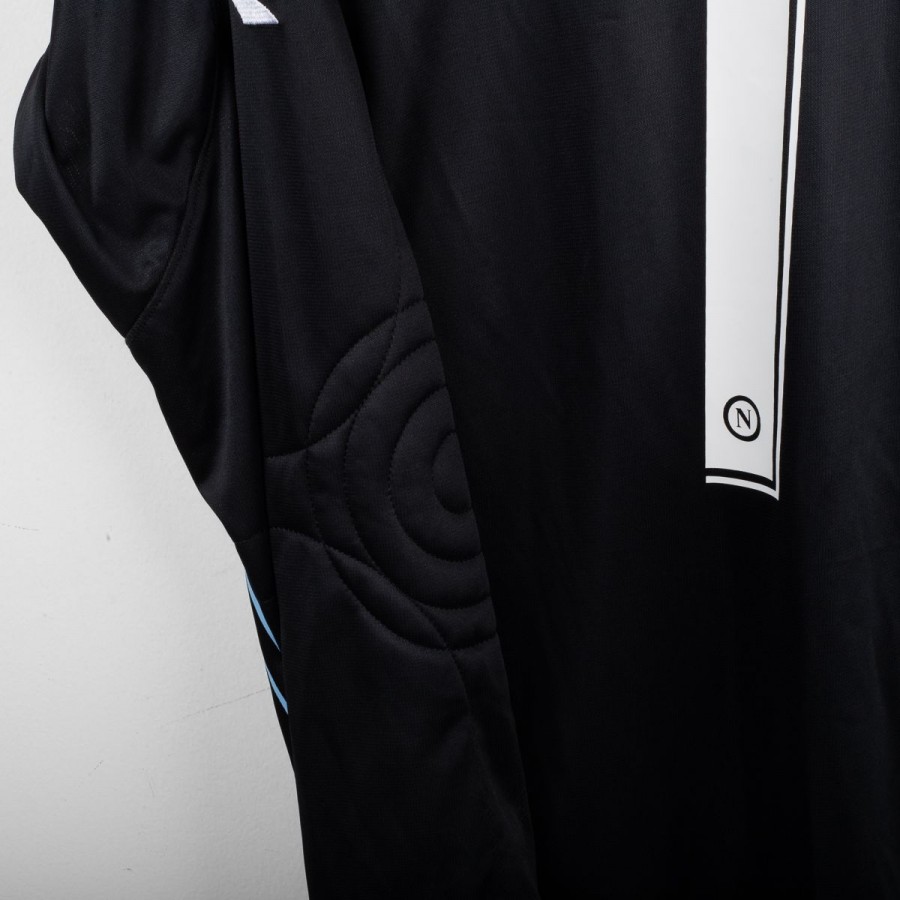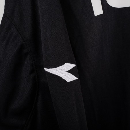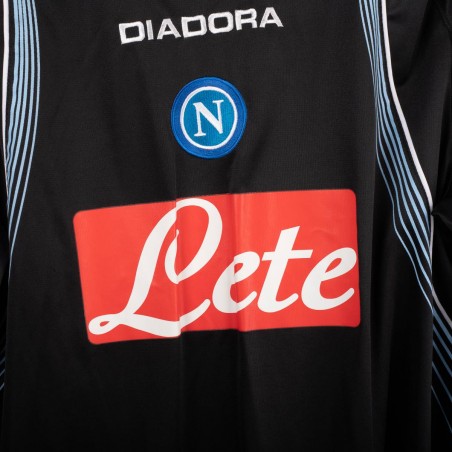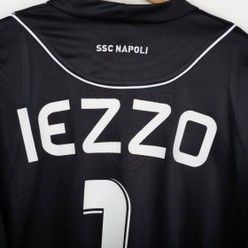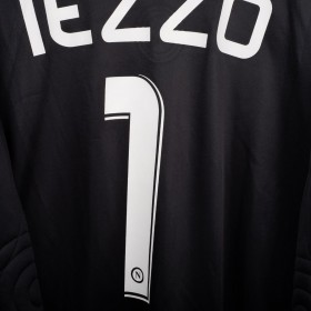 Maglia da portiere ufficiale del Napoli prodotta da Diadora per la stagione 2007/2008, con personalizzazione Gennaro Iezzo n.1. Modello a maniche lunghe di colore nero con dettagli azzurri sulle spalle e sui polsini. Logo Diadora ricamato sul petto destro e stemma SSC Napoli cucito lato cuore. Sponsor tecnico “Lete” stampato in rosso sul fronte. Patch Lega Calcio Serie A TIM cucita sulla manica destra. Nome “IEZZO” e numero 1 stampati sul retro in bianco. Tessuto tecnico leggero con rinforzi imbottiti su gomiti e fianchi, ideale per ruolo portiere. Taglia XXL (vestibilità italiana). Maglia originale Diadora, indossata dal portiere napoletano durante la sua esperienza con gli azzurri nella massima serie.