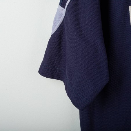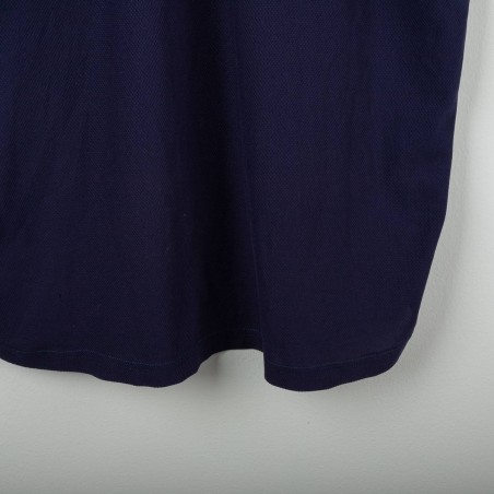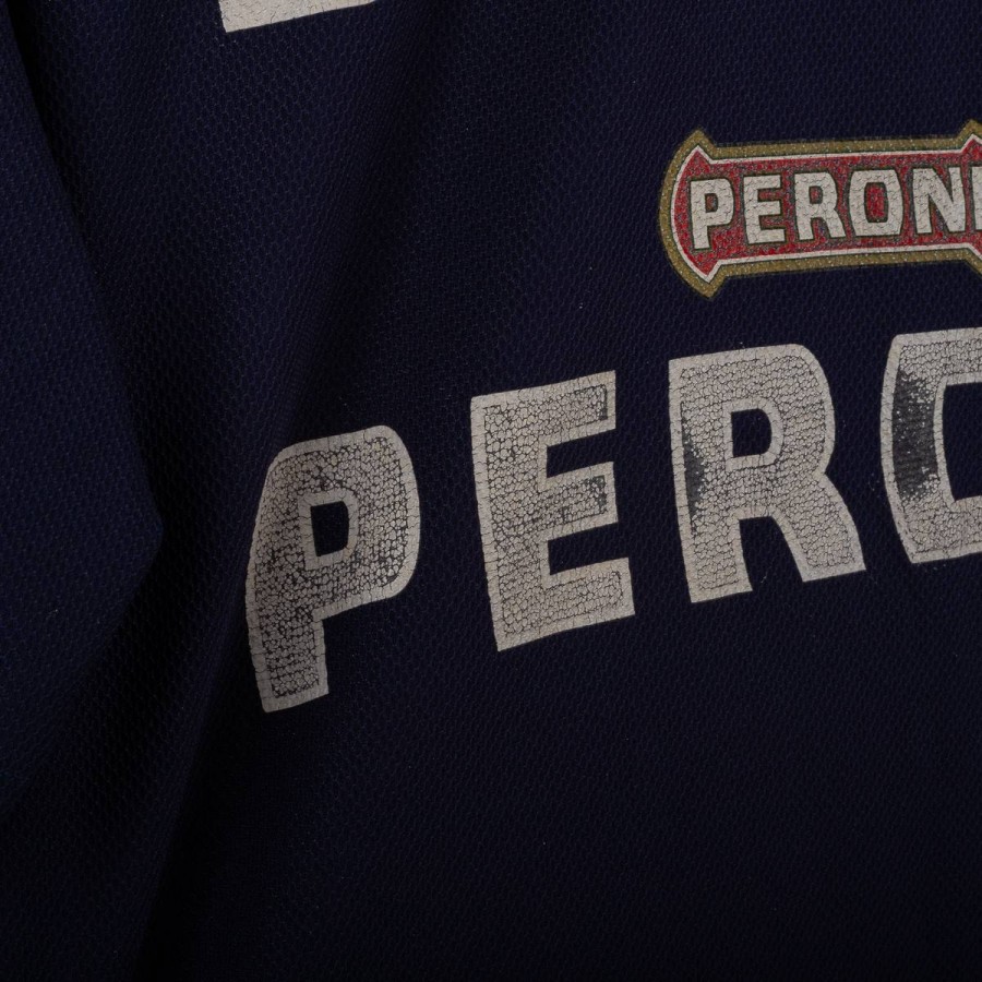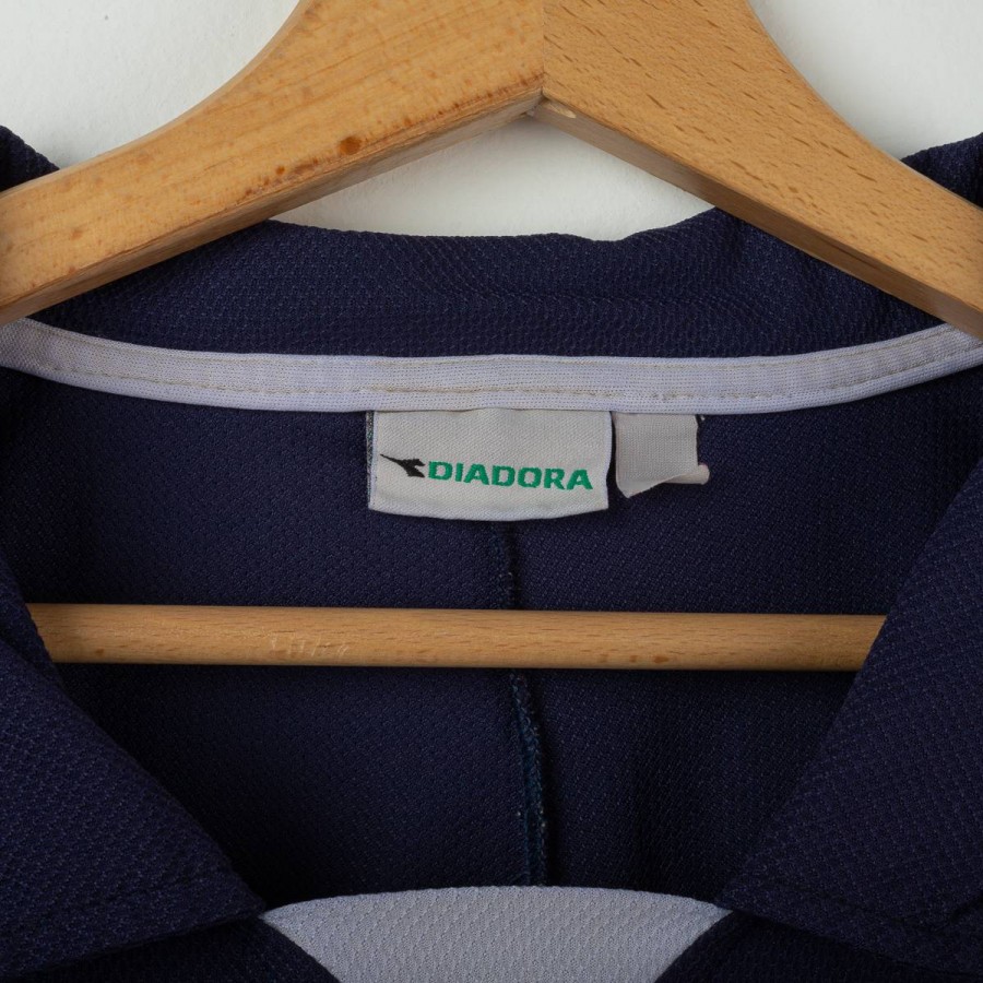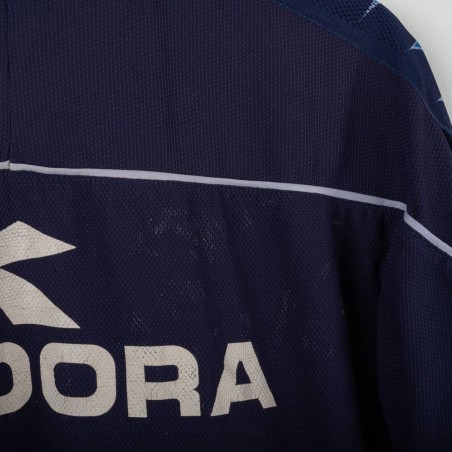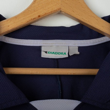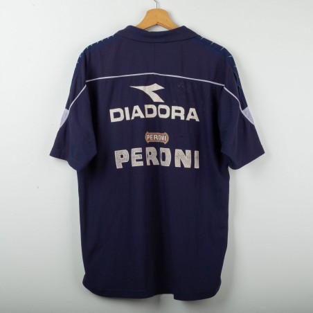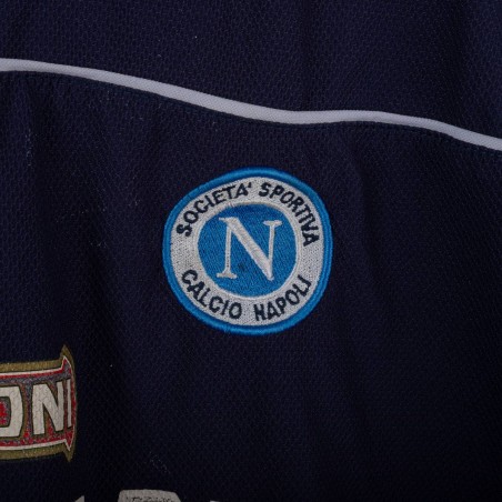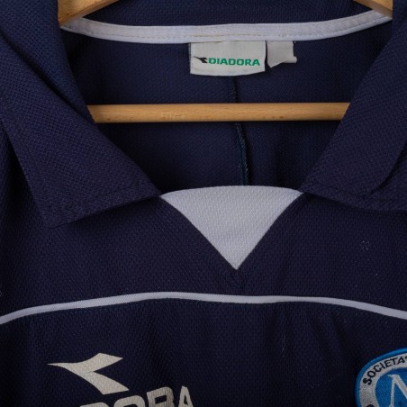 Maglia da allenamento del Napoli stagione 2000/2001 prodotta da Diadora. Modello a maniche corte di colore blu navy con dettagli bianchi e celesti sulle spalle. Logo Diadora ricamato sul petto destro e stemma SSC Napoli cucito lato cuore. Sponsor Peroni stampato in bianco fronte e retro. Numero 15 applicato in basso sul fronte. Vestibilità regolare. Una maglia storica legata agli anni della Serie A a cavallo del nuovo millennio. Taglia XL.