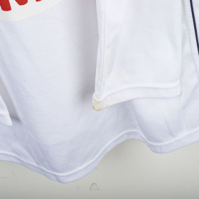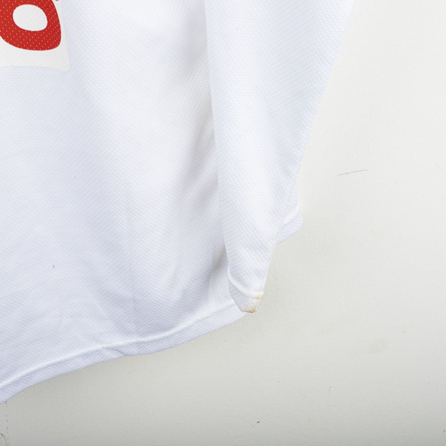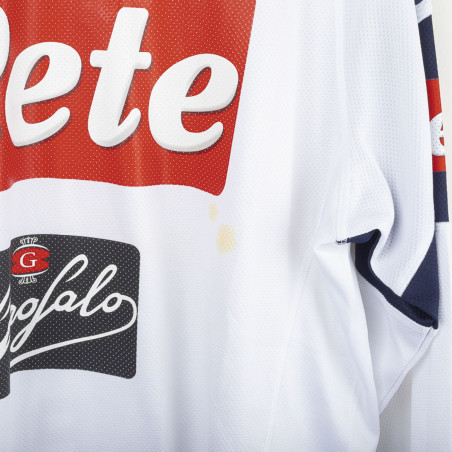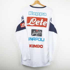 Felpa di allenamento del Napoli stagione 2019/2020, prodotta da Kappa. Colore bianco con inserti blu navy. Sponsor tecnico Kappa ricamato sul petto e sulle maniche. Sponsor principali Lete e Garofalo applicati in stampa gommata sul fronte, SSC Napoli e Kimbo sul retro. Stemma SSC Napoli cucito lato cuore. Modello a maniche lunghe, vestibilità regolare. Taglia XXXL.