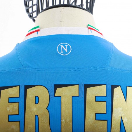 Maglia Gara nel tipo colore societario azzurro con nome e numero in color oro Mertens 14. Il colletto richiama il tricolore e riporta colori brillanti. Maniche con bordino bianco, su quella di sinistra è apposta la patch " FINALE TIM CUP - ROMA 2014" e quella di sinistra la classica toppa "TIM CUP". Gli sponsor commerciali sul fronte sono in ottime condizioni.