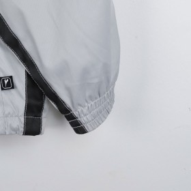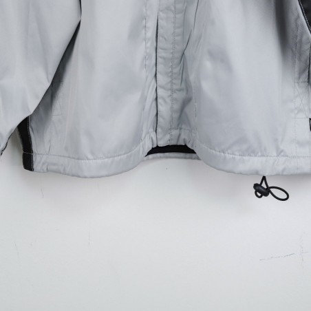 Modello full zip di colore grigio chiaro con dettagli in azzurro.