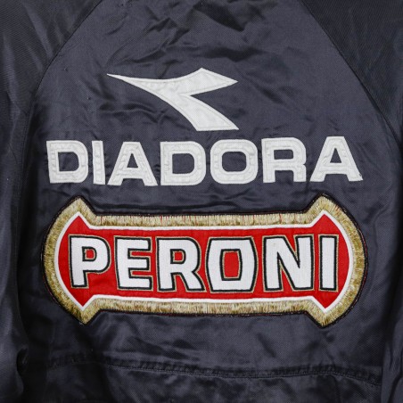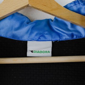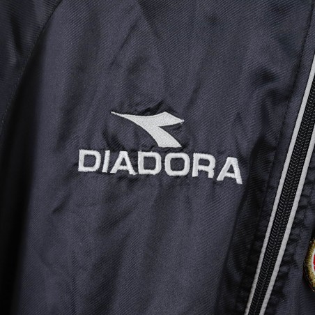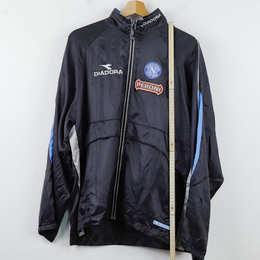 Giacca ufficiale del Napoli, stagione 2000/2001, prodotta dallo sponsor tecnico Diadora e caratterizzata dallo sponsor commerciale Peroni. La giacca è realizzata in un elegante colore nero con dettagli azzurri lungo le maniche e una chiusura a zip centrale. Sul petto sono presenti il logo Diadora ricamato a destra, lo stemma del Napoli cucito lato cuore e il logo Peroni in rilievo al centro. La scritta "SSC Napoli" è riportata all'interno del colletto alto, mentre le tasche con chiusura completano il design pratico e sportivo di questo capo iconico.